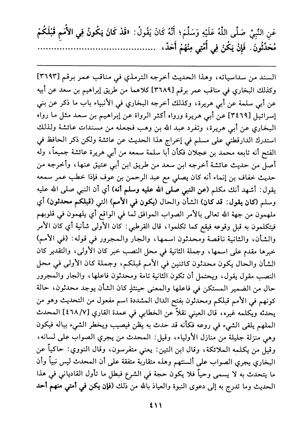 عَنِ النَّبِيّ صَلى اللهُ عَلَيهِ وَسَلمَ؛ أنَّهُ كَانَ يَقُولُ: "قَد كَانَ يَكُونُ فِي الأُمَمِ قَبْلَكُمْ مُحَدَّثُونَ. فَإِنْ يَكُنْ فِي أُمَّتِي مِنْهُمْ أَحَدٌ،