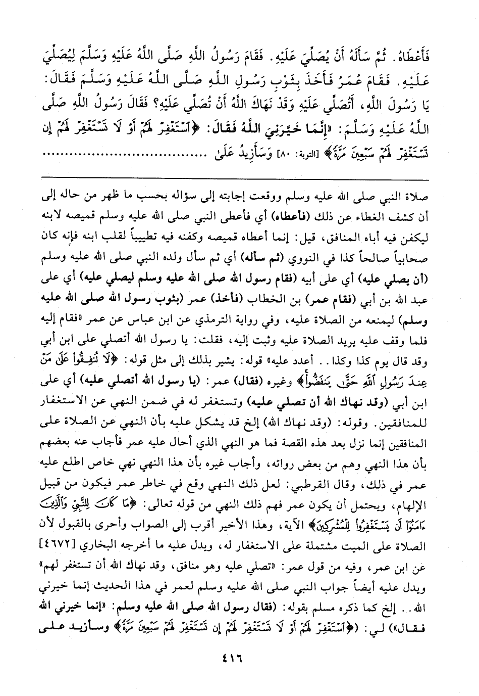 فَأَعْطَاهُ. ثُم سَأَلَهُ أَنْ يُصَلِّيَ عَلَيهِ. فَقَامَ رَسُولُ اللهِ صَلى اللهُ عَلَيهِ وَسَلمَ لِيُصَلِّيَ عَلَيهِ. فَقَامَ عُمَرُ فَأَخَذَ بِثَوْبِ رَسُولِ اللهِ صَلى اللهُ عَلَيهِ وَسَلَّمَ فَقَال: يَا رَسُولَ اللهِ، أَتُصَلي عَلَيهِ وَقَدْ نَهَاكَ اللهُ أَنْ تُصَلي عَلَيهِ؟ فَقَال رَسُولُ اللهِ صَلى اللهُ عَلَيهِ وَسَلمَ: "إِنمَا خَيَّرَنِيَ اللهُ فَقَال: {اسْتَغْفِرْ لَهُمْ أَوْ لَا تَسْتَغْفِرْ لَهُمْ إِنْ تَسْتَغْفِرْ لَهُمْ سَبْعِينَ مَرَّةً} [التوبة: ٨٠، وَسَأَزِيدُ عَلَي