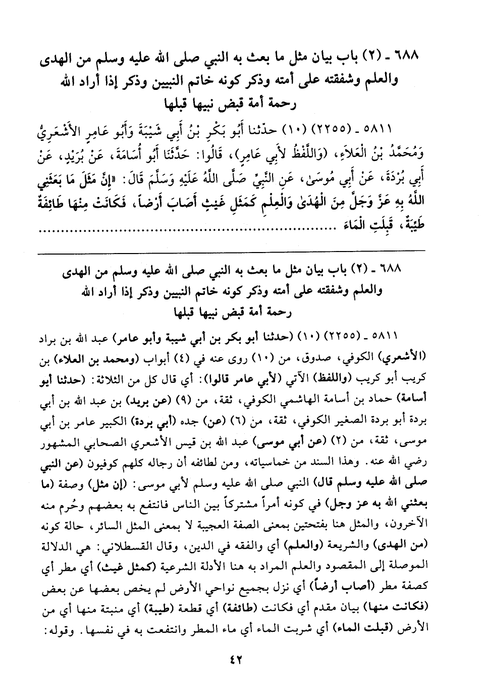 ٥٨١١ - (٢٢٥٥) (١٠) حدَّثنا أَبُو بَكْرٍ بْنُ أَبِي شَيبَةَ وَأَبُو عَامِرٍ الأَشْعَرِيُّ وَمُحَمَّدُ بْنُ الْعَلَاءِ، (وَاللَّفْظُ لأَبِي عَامِرٍ)، قَالُوا: حَدَّثَنَا أَبُو أُسَامَةَ، عَنْ بُرَيدٍ، عَنْ أَبِي بُرْدَةَ، عَنْ أَبِي مُوسَى، عَنِ النَّبِيِّ صَلَّى اللهُ عَلَيهِ وَسَلَّمَ قَال: "إِنَّ مَثَلَ مَا بَعَثَنِي اللهُ بِهِ عَزَّ وَجَلَّ مِنَ الْهُدَى وَالْعِلْمِ كَمَثَلِ غَيثٍ أَصَابَ أَرْضًا، فَكَانَتْ مِنْهَا طَائِفَةٌ طَيِّبَةٌ، قَبِلَتِ الْمَاءَ
