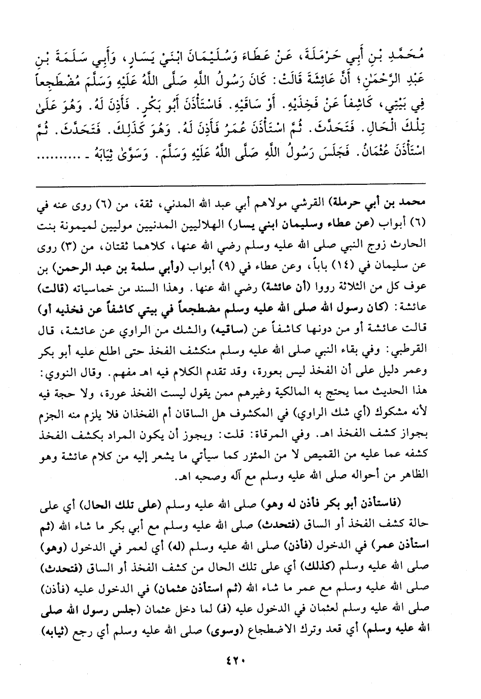 مُحَمَّدِ بْنِ أَبِي حَرْمَلَةَ، عَن عَطَاءَ وَسُلَيمَانَ ابْنَي يَسَارٍ، وَأَبِي سَلَمَةَ بْنِ عَبْدِ الرَّحْمَنِ؛ أَنَّ عَائِشَةَ قَالتْ: كَانَ رَسُولُ اللهِ صَلى اللهُ عَلَيهِ وَسَلمَ مُضطَجِعًا فِي بَيتِي، كَاشِفًا عَنْ فَخِذَيهِ. أوْ سَاقَيهِ. فَاسْتَأْذَنَ أَبُو بَكْرٍ. فَأَذِنَ لَهُ. وَهُوَ عَلَى تِلْكَ الْحَالِ. فَتَحَدَّثَ. ثُم اسْتَأْذَنَ عُمَرُ فَأَذِنَ لَهُ. وَهُوَ كَذَلِكَ. فَتَحَدَّثَ. ثُمَّ اسْتَأْذَنَ عُثْمَانُ. فَجَلَسَ رَسُولُ اللهِ صَلى اللهُ عَلَيهِ وَسَلَّمَ. وَسَوَّى ثِيَابَهُ-