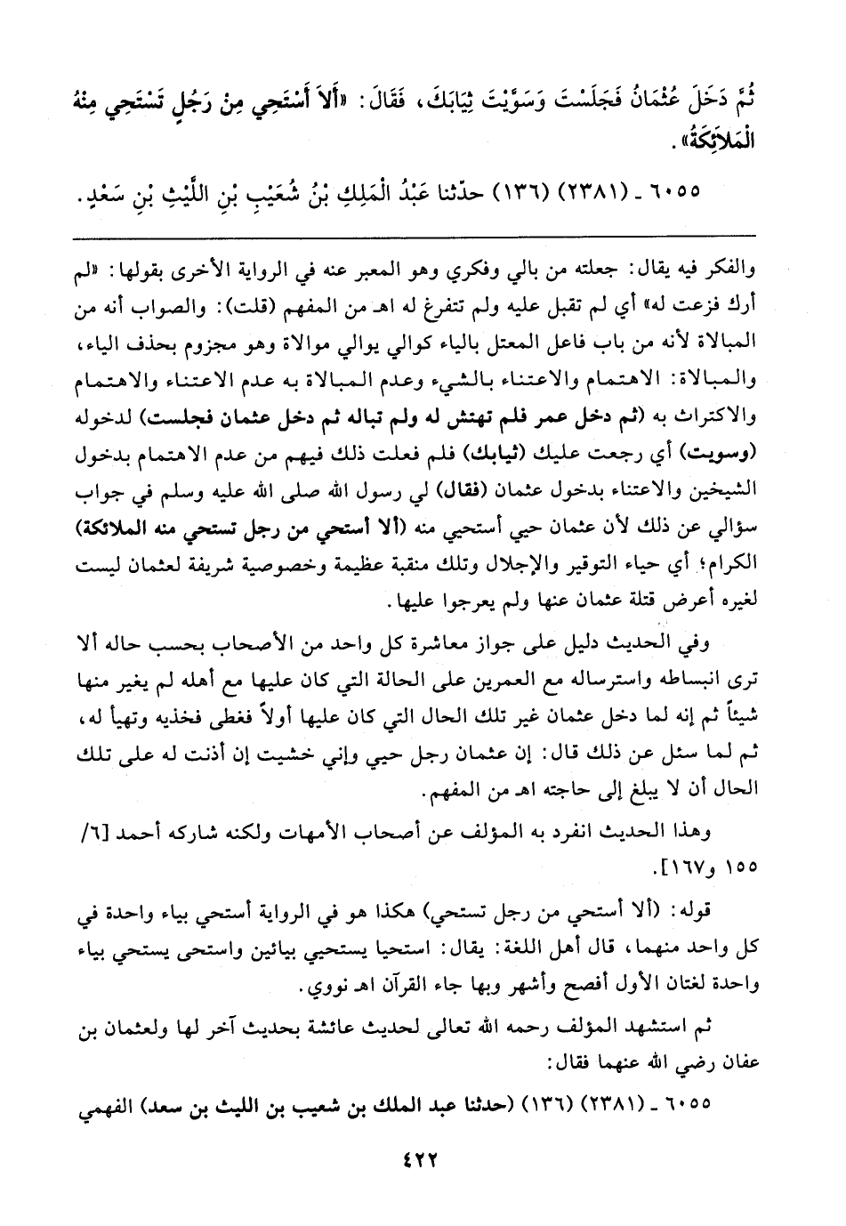 ثُم دَخَلَ عُثْمَانُ فَجَلَسْتَ وَسَوَّيتَ ثِيَابَكَ، فَقَال: "أَلا أَسْتَحِي مِن رَجُلٍ تَسْتَحِي مِنْهُ الْمَلائكَةُ".