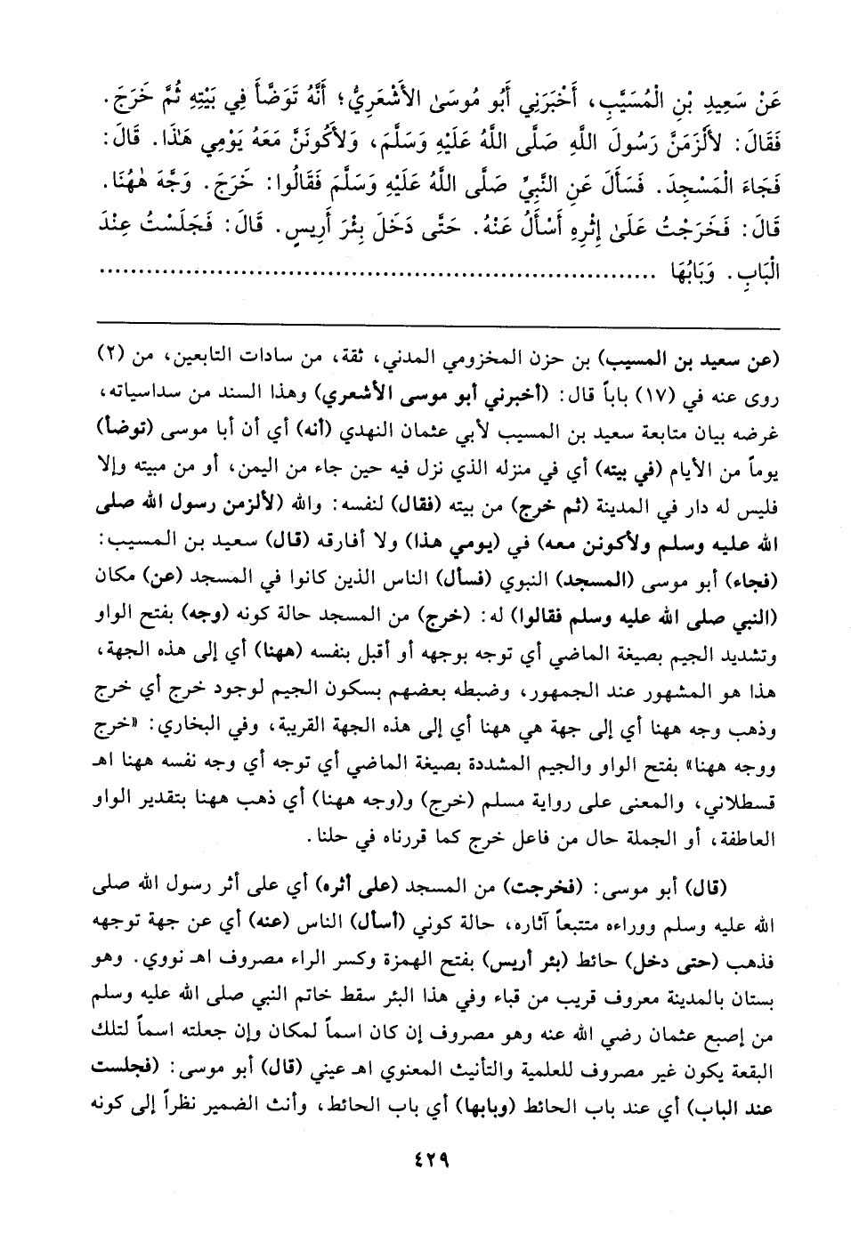 عَنْ سَعِيدِ بْنِ الْمُسَيَّبِ، أَخْبَرَنِي أَبُو مُوسَى الأشَعَرِيُّ؛ أَنهُ تَوَضَّأ فِي بَيتِهِ ثُمَّ خَرَجَ. فَقَال: لأَلْزَمَنَّ رَسُولَ اللهِ صَلى اللهُ عَلَيهِ وَسَلمَ، وَلأَكُونَنَّ مَعَهُ يَوْمِي هَذَا. قَال: فَجَاءَ الْمَسْجِدَ. فَسَأَلَ عَنِ النَّبِيِّ صَلى اللهُ عَلَيهِ وَسَلمَ فَقَالُوا: خَرَجَ. وَجَّهَ ههُنَا. قَال: فَخَرَجْتُ عَلَى إِثْرِهِ أَسْأَلُ عَنْهُ. حَتى دَخَلَ بِئْرَ أَرِيسٍ. قَال: فَجَلَسْتُ عِنْدَ الْبَابِ، وَبَابُهَا