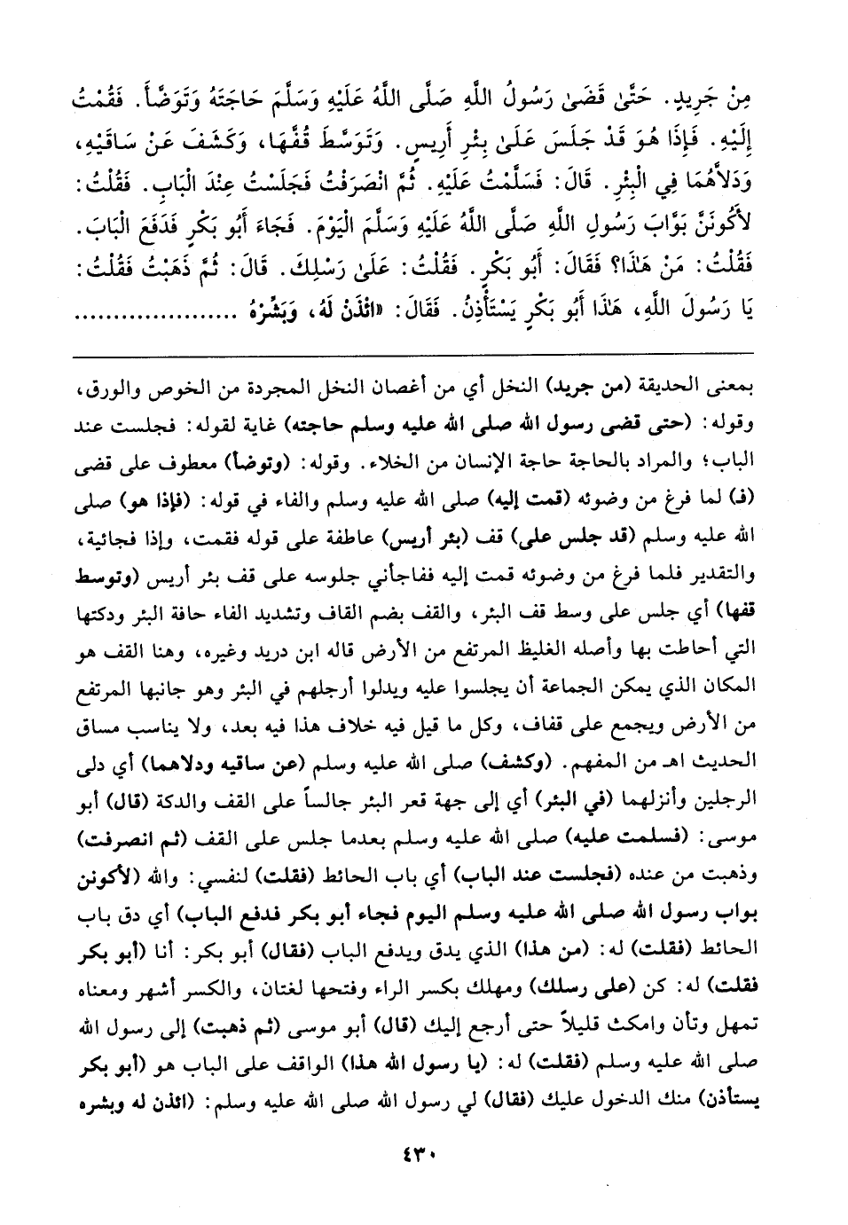 مِنْ جَرِيدٍ. حَتى قَضَى رَسُولُ اللهِ صَلى اللهُ عَلَيهِ وَسَلمَ حَاجَتَهُ وَتَوَضَّأَ. فَقُمْتُ إِلَيهِ. فَإِذَا هُوَ قَدْ جَلَسَ عَلَى بِئْرِ أَرِيسٍ. وَتَوَسَّطَ قُفَّهَا، وَكَشَفَ عَن سَاقَيهِ، وَدَلَّاهُمَا فِي الْبِئْرِ. قَال: فَسَلَّمْتُ عَلَيهِ. ثُمَّ انْصَرَفْتُ فَجَلَسْتُ عِنْدَ الْبَابِ. فَقُلْتُ: لأَكُونَنَّ بَوَّابَ رَسُولِ اللهِ صَلى اللهُ عَلَيهِ وَسَلمَ الْيَوْمَ. فَجَاءَ أَبُو بَكرٍ فَدَفَعَ الْبَابَ. فَقُلْتُ: مَنْ هَذَا؟ فَقَال: أَبُو بَكرٍ. فَقُلْتُ: عَلَى رَسْلِكَ. قَال: ثُمَّ ذَهَبْتُ فَقُلْتُ: يَا رَسُولَ اللهِ، هَذَا أَبُو بَكرٍ يَسْتَأْذِنُ. فَقَال: "ائْذَن لَهُ، وَبَشِّرْهُ