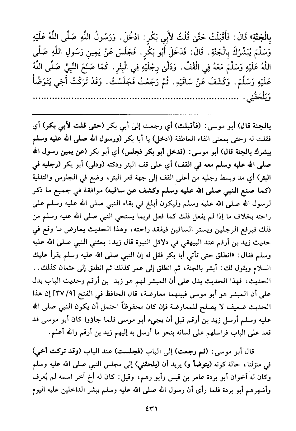 بِالْجَنَّةِ" قَال: فَأَقْبَلْتُ حَتَّى قُلْتُ لأَبِي بَكرٍ: ادْخُل. وَرَسُولُ اللهِ صَلى اللهُ عَلَيهِ وَسَلَّمَ يُبَشِّرُكَ بِالْجَنَّةِ. قَال: فَدَخَلَ أَبُو بَكْرٍ. فَجَلَسَ عَن يَمِينِ رَسُولِ اللهِ صَلى اللهُ عَلَيهِ وَسَلَّمَ مَعَهُ فِي القُفِّ. وَدَلَّى رِجْلَيهِ فِي الْبِئْرِ. كَمَا صَنَعَ النَّبِيّ صَلى اللهُ عَلَيهِ وَسَلمَ. وَكَشَفَ عَنْ سَاقَيهِ. ثُم رَجَعْتُ فَجَلَسْتُ. وَقَدْ تَرَكتُ أَخِي يَتَوَضَّأ وَيَلْحَقُنِي