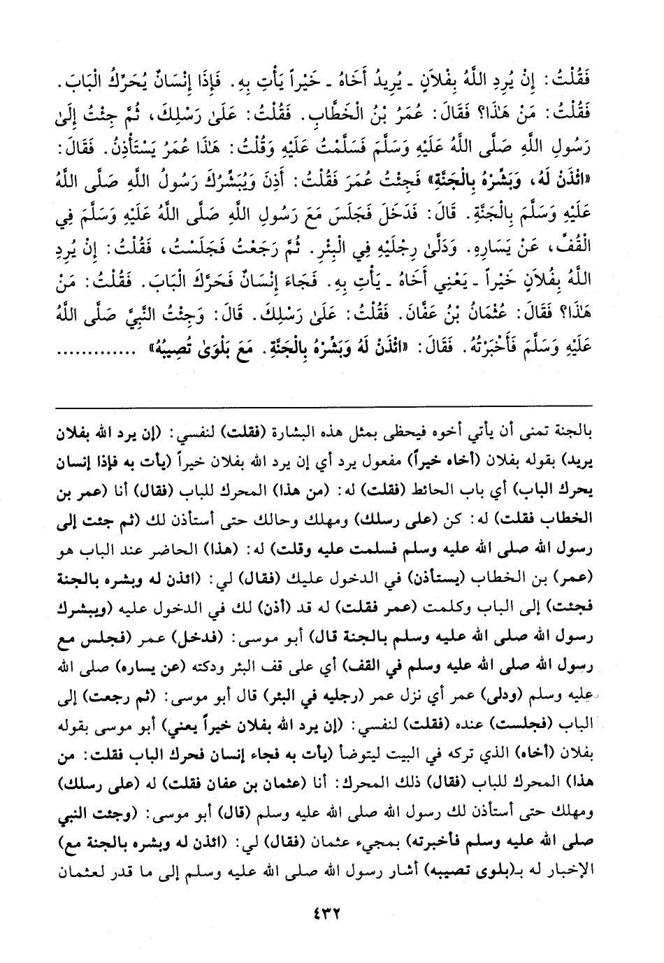 فَقُلْتُ: إِنْ يُرِدِ اللهُ بِفْلانٍ -يُرِيدُ أَخَاهُ- خَيرًا يَأْتِ بِهِ. فَإِذَا إِنْسَانْ يُحَرِّكُ الْبَابَ. فَقُلْتُ: مَنْ هَذَا؟ فَقَال: عُمَرُ بْنُ الْخَطَّابِ. فَقُلْتُ: عَلَي رَسْلِكَ، ثُمَّ جِئتُ إِلَى رَسُولِ اللهِ صَلى اللَّهُ عَلَيهِ وَسَلمَ فَسَلَّمْتُ عَلَيهِ وَقُلْتُ: هَذَا عُمَرُ يَسْتَأذِنُ. فَقَال: "ائْذَنْ لَهُ، وَبَشِّرْهُ بِالْجَنَّةِ" فَجِئتُ عُمَرَ فَقُلْتُ: أَذِنَ ويبَشِّرُكَ رَسُولُ اللهِ صَلى اللهُ عَلَيهِ وَسَلمَ بِالجَنةِ. قَال: فَدَخَلَ فَجَلَسَ مَعَ رَسُولِ اللهِ صَلى اللهُ عَلَيهِ وَسَلمَ فِي الْقُفِّ، عَن يَسَارِهِ. وَدَلَّى رِجْلَيهِ فِي الْبِئرِ. ثُم رَجَعتُ فَجَلَسْتُ، فَقُلْتُ: إِنْ يُرِدِ اللهُ بِفُلانٍ خَيرًا -يَعْنِي أخَاهُ- يَأتِ بِهِ. فَجَاءَ إِنْسَانٌ فَحَرَّكَ البَابَ. فَقُلْتُ: مَنْ هذَا؟ فَقَال: عُثْمَانُ بْنُ عَفانَ. فَقُلْتُ: عَلَى رَسْلِكَ. قَال: وَجِئتُ النَّبِيّ صَلى اللهُ عَلَيهِ وَسَلمَ فَأَخْبَرْتُهُ. فَقَال: "ائْذَنْ لَهُ وَبَشِّرهُ بِالْجَنَّةِ. مَعَ بَلوَى تُصِيبُهُ"