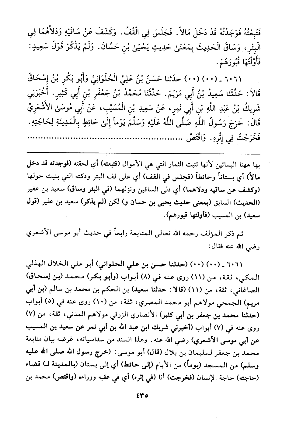 ٦٠٦١ - (٠٠) (٠٠) (حدثنا حسن بن علي الحلواني) أبو علي الخلال الهذلي المكي، ثقة، من (١١) روى عنه في (٨) أبواب (وأبو بكر) محمد (بن إسحاق) الصاغاني، ثقة، من (١١) (قالا: حدثنا سعيد) بن الحكم بن محمد بن سالم (بن أبي مريم) الجمحي مولاهم أبو محمد المصري، ثقة، من (١٠) روى عنه في (٥) أبواب (حدثنا محمد بن جعفر بن أبي كثير) الأنصاري الزرقي مولاهم المدني، ثقة، من (٧) روى عنه في (٧) أبواب (أخبرني شريك ابن عبد الله بن أبي نمر عن سعيد بن المسيب عن أبي موسى الأشعري) رضي الله عنه. وهذا السند من سداسياته، غرضه بيان متابعة محمد بن جعفر لسليمان بن بلال (قال) أبو موسى: (خرج رسول الله صلى الله عليه وسلم) من المسجد (يومًا) من الأيام (إلى حائط) أي إلى بستان (بالمدينة لـ) قضاء (حاجته) حاجة الإنسان (فخرجت) أنا (في إثره) أي في عقبه ووراءه (واقتص) محمد بن