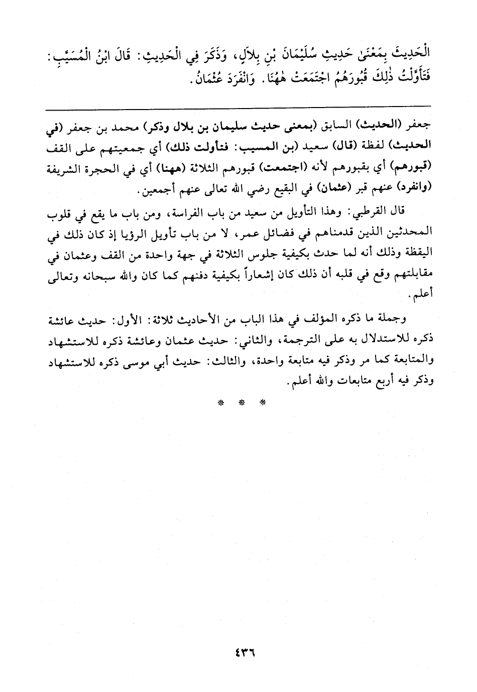 جعفر (الحديث) السابق (بمعنى حديث سليمان بن بلال وذكر) محمد بن جعفر (في الحديث) لفظة (قال) سعيد (بن المسيب: فتأولت ذلك) أي جمعيتهم على القف (قبورهم) أي بقبورهم لأنه (اجتمعت) قبورهم الثلاثة (ها هنا) أي في الحجرة الشريفة (وانفرد) عنهم قبر (عثمان) في البقيع رضي الله تعالى عنهم أجمعين.