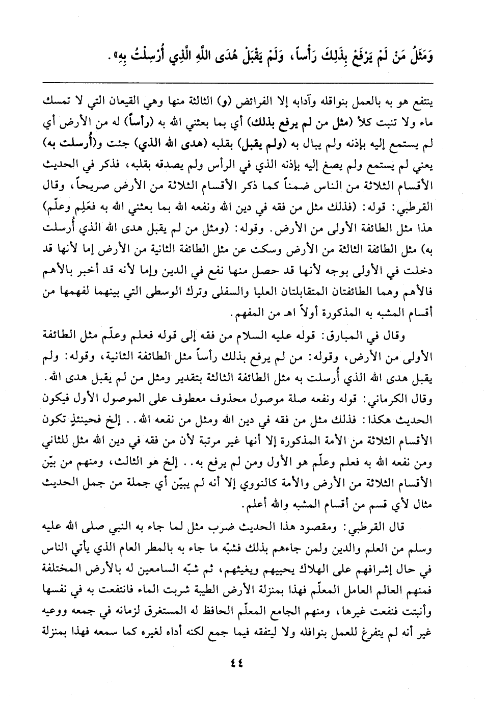 قال القرطبي: ومقصود هذا الحديث ضرب مثل لما جاء به النبي صلى الله عليه وسلم من العلم والدين ولمن جاءهم بذلك فشبَّه ما جاء به بالمطر العام الَّذي يأتي الناس في حال إشرافهم على الهلاك يحييهم ويغيثهم، ثم شبّه السامعين له بالأرض المختلفة فمنهم العالم العامل المعلّم فهذا بمنزلة الأرض الطيبة شربت الماء فانتفعت به في نفسها وأنبتت فنفعت غيرها، ومنهم الجامع المعلّم الحافظ له المستغرق لزمانه في جمعه ووعيه غير أنَّه لم يتفرغ للعمل بنوافله ولا ليتفقه فيما جمع لكنه أداه لغيره كما سمعه فهذا بمنزلة
