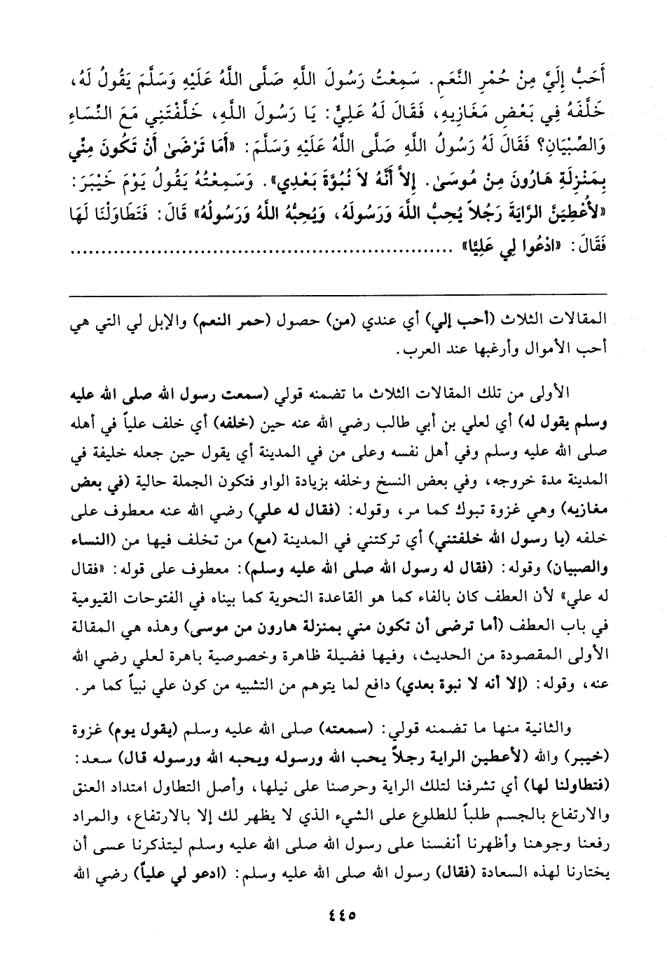 أحَبُّ إِلَيَّ مِنْ حُمْرِ النَّعَمِ. سَمِعْتُ رَسُولَ اللهِ صَلَّى اللهُ عَلَيهِ وَسَلَّمَ يَقُولُ لَهُ، خَلَّفَهُ فِي بَعْضِ مَغَازِيهِ، فَقَال لَهُ عَلِيٌّ: يَا رَسُولَ اللهِ، خَلَّفْتَنِي مَعَ النَّسَاءِ وَالصِّبْيَانِ؟ فَقَال لَهُ رَسُولُ اللهِ صَلَّى اللهُ عَلَيهِ وَسَلَّمَ: "أَمَا تَرْضَى أَنْ تَكُونَ مِنِّي بِمَنْزِلَةِ هَارُونَ مِنْ مُوسَى. إلَّا أَنَّهُ لَا نُبُوَّةَ بَعْدِي". وَسَمِعْتُهُ يَقُولُ يَوْمَ خَيبَرَ: "لأعْطِيَنَّ الرَّايَةَ رَجُلًا يُحِبُّ اللهَ وَرَسُولَهُ، وَيُحِبُّهُ اللهُ وَرَسُولُهُ" قَال: فَتَطَاوَلْنَا لَهَا فَقَال: "ادْعُوا لِي عَلِيًّا"
