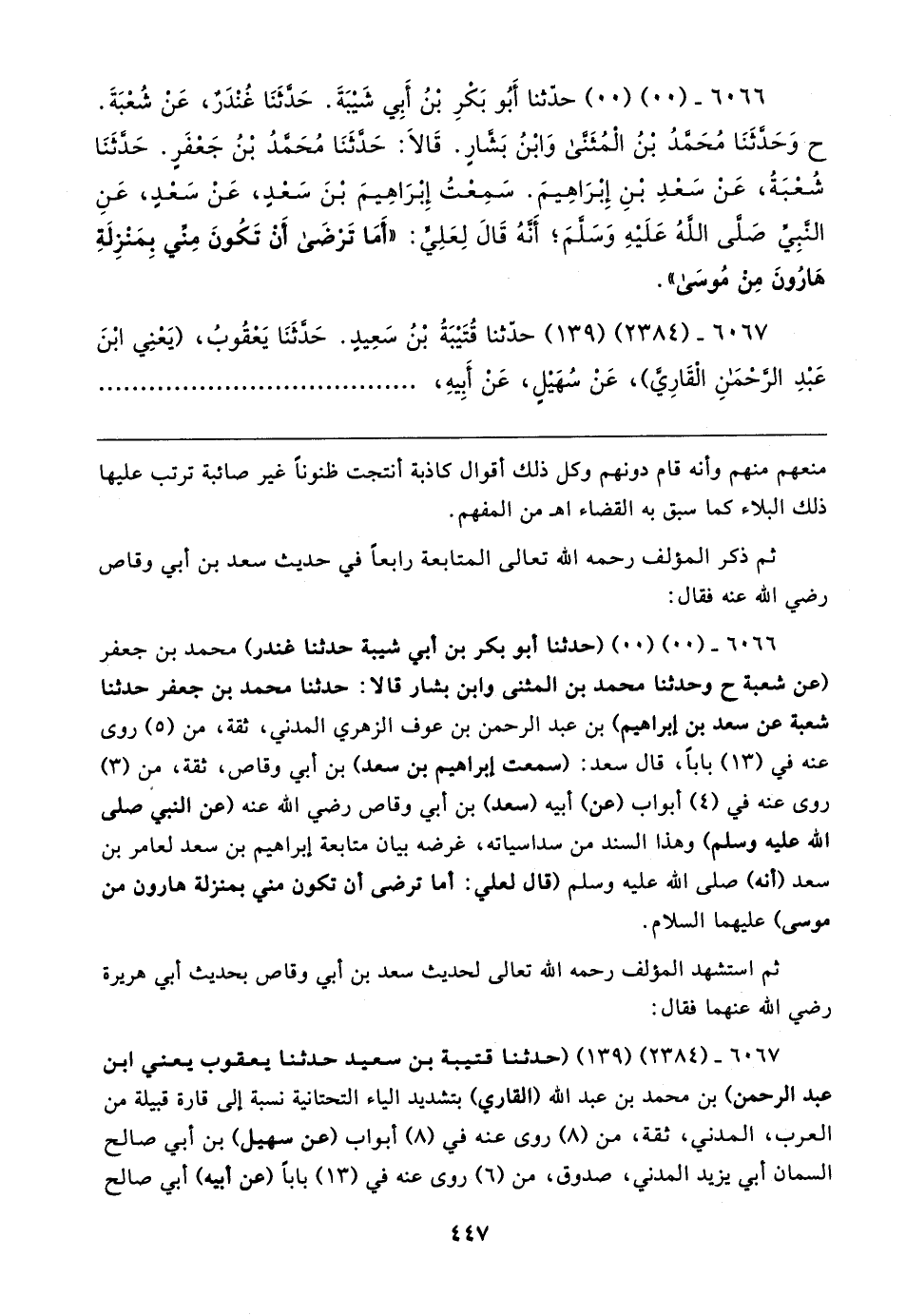 ٦٠٦٦ - (٠٠) (٠٠) (حدثنا أبو بكر بن أبي شيبة حدثنا غندر) محمد بن جعفر (عن شعبة ح وحدثنا محمد بن المثنى وابن بشار قالا: حدثنا محمد بن جعفر حدثنا شعبة عن سعد بن إبراهيم) بن عبد الرحمن بن عوف الزهري المدني، ثقة، من (٥) روى عنه في (١٣) بابا، قال سعد: (سمعت إبراهيم بن سعد) بن أبي وقاص، ثقة، من (٣) روى عنه في (٤) أبواب (عن) أبيه (سعد) بن أبي وقاص رضي الله عنه (عن النبي صلى الله عليه وسلم) وهذا السند من سداسياته، غرضه بيان متابعة إبراهيم بن سعد لعامر بن سعد (أنه) صلى الله عليه وسلم (قال لعلي: أما ترضى أن تكون مني بمنزلة هارون من موسى) عليهما السلام.