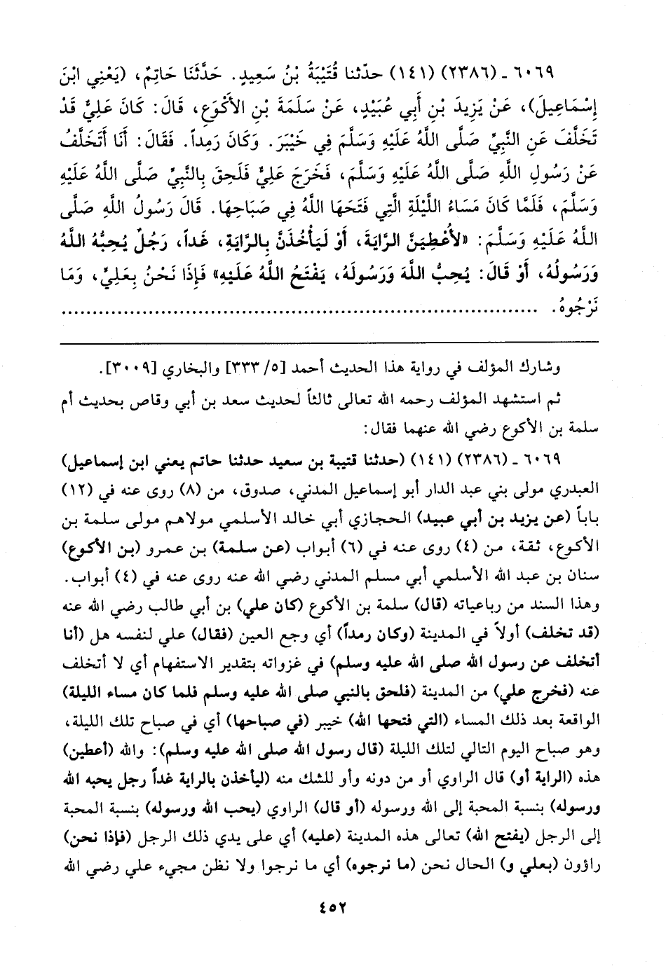 ٦٠٦٩ - (٢٣٨٦) (١٤١) (حدثنا قتيبة بن سعيد حدثنا حاتم يعني ابن إسماعيل) العبدري مولى بني عبد الدار أبو إسماعيل المدني، صدوق، من (٨) روى عنه في (١٢) بابا (عن يزيد بن أبي عبيد) الحجازي أبي خالد الأسلمي مولاهم مولى سلمة بن الأكوع، ثقة، من (٤) روى عنه في (٦) أبواب (عن سلمة) بن عمرو (بن الأكوع) سنان بن عبد الله الأسلمي أبي مسلم المدني رضي الله عنه روى عنه في (٤) أبواب. وهذا السند من رباعياته (قال) سلمة بن الأكوع (كان علي) بن أبي طالب رضي الله عنه (قد تخلف) أولًا في المدينة (وكان رمدًا) أي وجع العين (فقال) علي لنفسه هل (أنا أتخلف عن رسول الله صلى الله عليه وسلم) في غزواته بتقدير الاستفهام أي لا أتخلف عنه (فخرج علي) من المدينة (فلحق بالنبي صلى الله عليه وسلم فلما كان مساء الليلة) الواقعة بعد ذلك المساء (التي فتحها الله) خيبر (في صباحها) أي في صباح تلك الليلة، وهو صباح اليوم التالي لتلك الليلة (قال رسول الله صلى الله عليه وسلم): والله (أعطين) هذه (الراية أو) قال الراوي أو من دونه وأو للشك منه (ليأخذن بالراية غدًا رجل يحبه الله ورسوله) بنسبة المحبة إلى الله ورسوله (أو قال) الراوي (يحب الله ورسوله) بنسبة المحبة إلى الرجل (يفتح الله) تعالى هذه المدينة (عليه) أي على يدي ذلك الرجل (فإذا نحن) راؤون (بعلي و) الحال نحن (ما نرجوه) أي ما نرجوا ولا نظن مجيء علي رضي الله