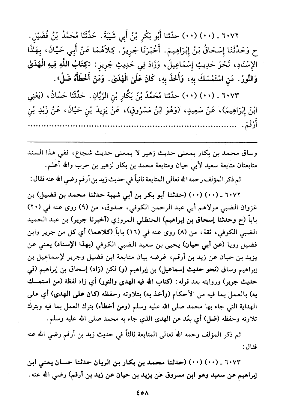 ٦٠٧٢ - (٠٠) (٠٠) (حدثنا أبو بكر بن أبي شيبة حدثنا محمد بن فضيل) بن غزوان الضبي مولاهم أبي عبد الرحمن الكوفي، صدوق، من (٩) روى عنه في (٢٠) بابا (ح وحدثنا سحاق بن إبراهيم) الحنظلي المروزي (أخبرنا جرير) بن عبد الحميد الضبي الكوفي، ثقة، من (٨) روى عنه في (١٦) بابا (كلاهما) أي كل من جرير وابن فضيل رويا (عن أبي حيان) يحيى بن سعيد الضبي الكوفي (بهذا الإسناد) يعني عن يزيد بن حيان عن زيد بن أرقم، غرضه بيان متابعة ابن فضيل وجرير لإسماعيل بن إبراهيم وساق (نحو حديث إسماعيل) بن إبرا هيم (و) لكن (زاد) إسحاق بن إبراهيم (في حديث جرير) وروايته بعد قوله: (كتاب الله فيه الهدى والنور) أي زاد لفظة (من استمسك به) بالعمل بما فيه من الأحكام (وأخذ به) بتلاوته وحفظه (كان على الهدى) أي على الهداية التي جاء بها محمد صلى الله عليه وسلم (ومن أخطأه) بترك العمل بما فيه وبترك تلاوته وحفظه (ضل) أي بعُد عن الهدى الذي جاء به محمد صلى الله عليه وسلم.