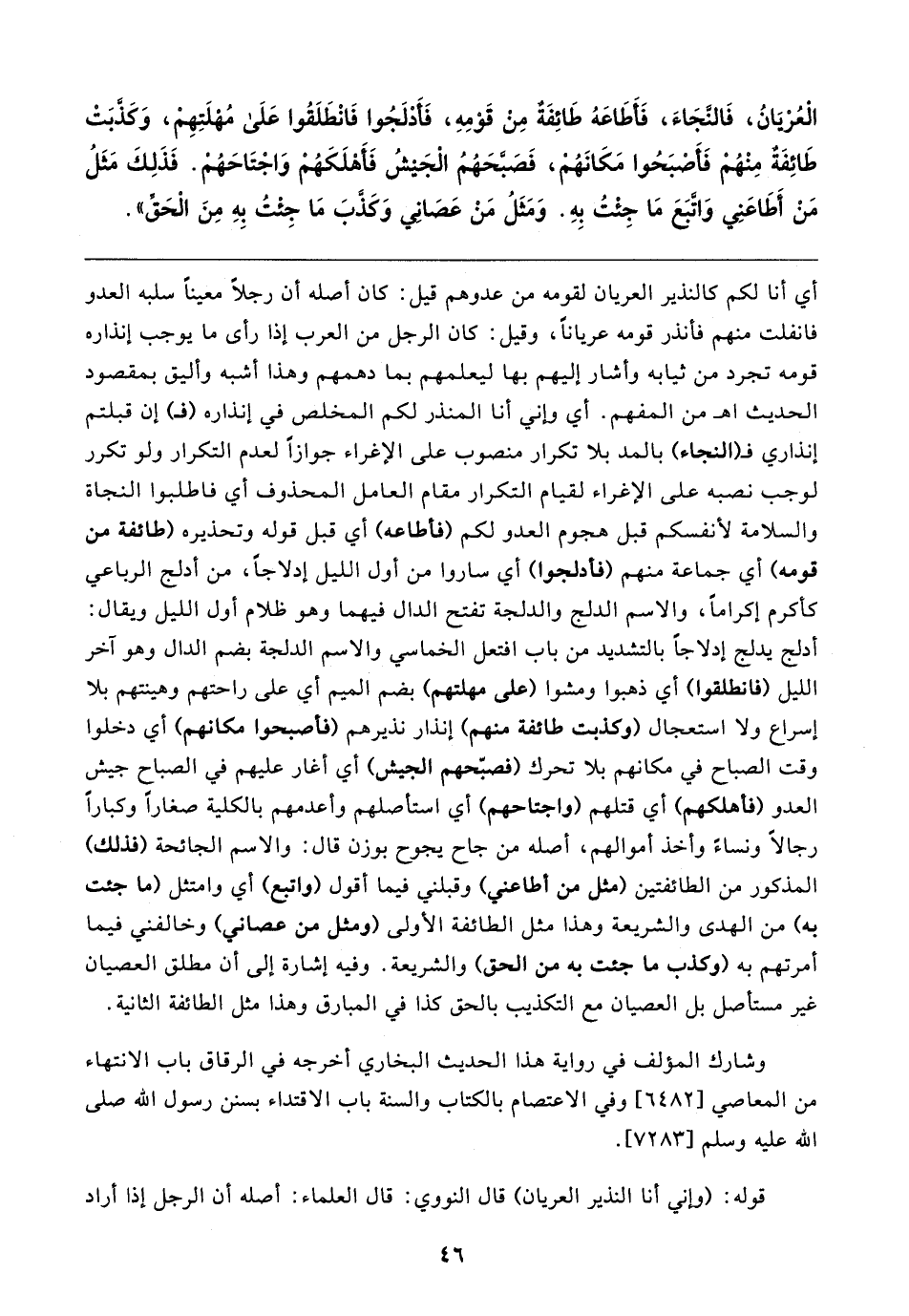 الْعُرْيَانُ، فَالنَّجَاءَ، فَأَطَاعَهُ طَائِفَةٌ مِنْ قَوْمِهِ، فَأَدْلَجُوا فَانْطَلَقُوا عَلَى مُهْلَتِهِمْ، وَكَذَّبَتْ طَائِفَةٌ مِنْهُمْ فَأَصْبَحُوا مَكَانَهُمْ، فَصَبَّحَهُمُ الْجَيشُ فَأَهْلَكَهُمْ وَاجْتَاحَهُمْ. فَذَلِكَ مَثَلُ مَنْ أَطَاعَنِي وَاتَّبَعَ مَا جِئْتُ بِهِ. وَمَثَلُ مَنْ عَصَاني وَكَذَّبَ مَا جِئْتُ بِهِ مِنَ الْحَقِّ"