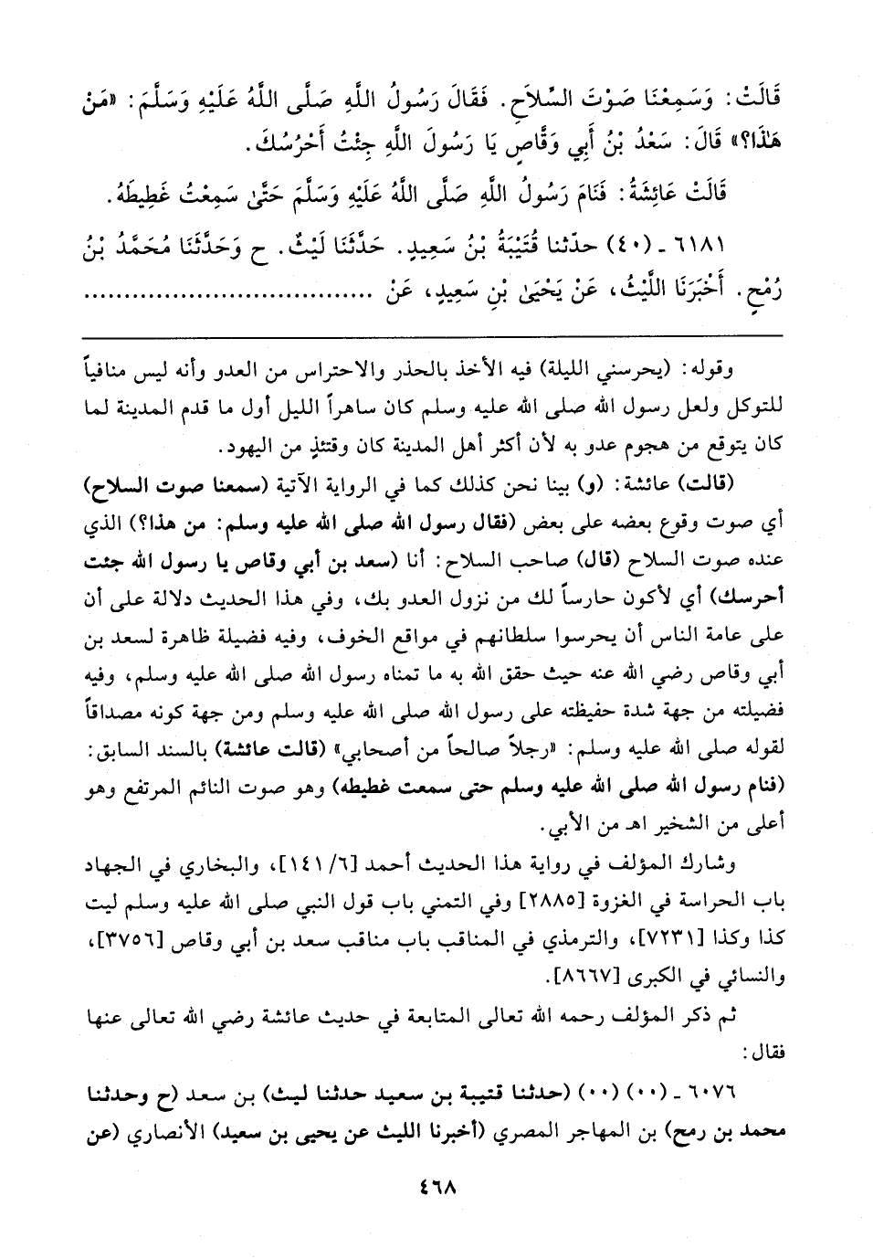 قَالتْ: وَسَمِعْنَا صَوْتَ السِّلاحِ. فَقَال رَسُولُ اللهِ صَلَّى اللهُ عَلَيهِ وَسَلَّمَ: "مَنْ هَذَا؟ " قَال: سَعْدُ بْنُ أَبِي وَقَّاصٍ يَا رَسُولَ اللهِ جِئْتُ أَحْرُسُكَ.