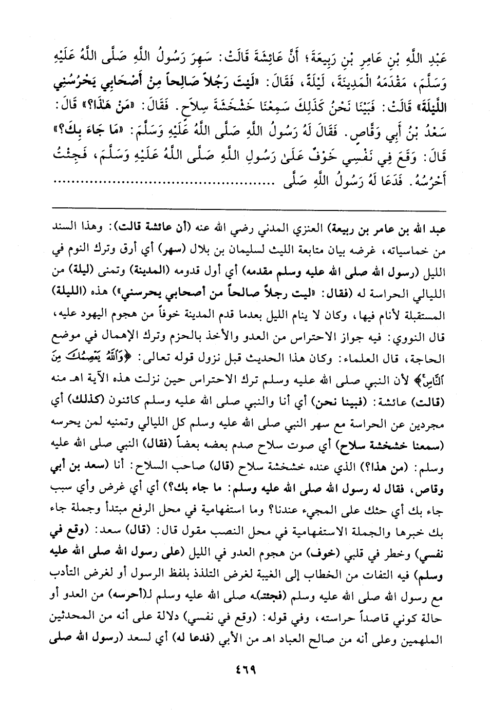 عَبْدِ اللهِ بْنِ عَامِرِ بْنِ رَبِيعَةَ؛ أَن عَائِشَةَ قَالتْ: سَهِرَ رَسُولُ اللهِ صَلَّى اللهُ عَلَيهِ وَسَلَّمَ، مَقْدَمَهُ الْمَدِينَةَ، لَيلَةً، فَقَال: "لَيتَ رَجُلًا صَالِحًا مِنْ أَصْحَابِي يَحْرُسُنِي اللَّيلَةَ" قَالتْ: فَبَينَا نَحْنُ كَذَلِكَ سَمِعْنَا خَشْخَشَةَ سِلاحٍ. فَقَال: "مَنْ هَذا؟ " قَال: سَعْدُ بْنُ أَبِي وَقَّاصٍ. فَقَال لَهُ رَسُولُ اللهِ صَلَّى اللهُ عَلَيهِ وَسَلَمَ: "مَا جَاءَ بِكَ؟ " قَال: وَقَعَ فِي نَفْسِي خَوْفٌ عَلَى رَسُولِ اللهِ صَلَّى اللهُ عَلَيهِ وَسَلَمَ، فَجِئْتُ أَحْرُسُهُ. فَدَعَا لَهُ رَسُولُ اللهِ صَلَّى