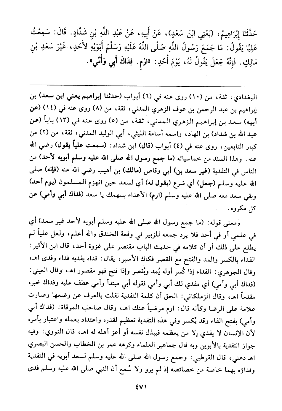 حَدَّثَنَا إِبْرَاهِيمُ، (يَعْنِي ابْنَ سَعْدٍ)، عَنْ أَبِيهِ، عَنْ عَبْدِ اللهِ بْنِ شَدَّادٍ. قَال: سَمِعْتُ عَلِيًّا يَقُولُ: مَا جَمَعَ رَسُولُ اللهِ صَلَّى اللهُ عَلَيهِ وَسَلَّمَ أَبَوَيهِ لأَحَدٍ، غَيرَ سَعْدِ بْنِ مَالِكٍ. فَإِنهُ جَعَلَ يَقُولُ لَهُ، يَوْمَ أُحُدٍ: "ارْمِ. فِدَاكَ أَبِي وَأُمِّي"