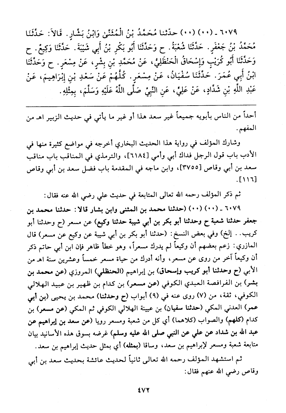 ٦٠٧٩ - (٠٠) (٠٠) حدَّثنا مُحَمَّدُ بْنُ الْمُثَنَّى وَابْنُ بَشَّارٍ. قَالا: حَدَّثَنَا مُحَمَّدُ بْنُ جَعْفَرٍ. حَدَّثَنَا شُعْبَةُ. ح وَحَدَّثَنَا أَبُو بَكرِ بْنُ أَبِي شَيبَةَ. حَدَّثَنَا وَكِيعٌ. ح وَحَدَّثَنَا أَبُو كُرَيبٍ وَإِسْحَاق الْحَنْظَلِيُّ، عَنْ مُحَمَّدِ بْنِ بِشْرٍ، عَنْ مِسْعَرٍ. ح وَحَدَّثَنَا ابْنُ أَبِي عُمَرَ. حَدَّثَنَا سُفْيَانُ، عَنْ مِسْعَرٍ. كُلُّهُمْ عَنْ سَعْدِ بْنِ إِبْرَاهِيمَ، عَنْ عَبْدِ اللهِ بْنِ شَدَّادٍ، عَنْ عَلِيٍّ، عَنِ النَّبِيِّ صَلَّى اللهُ عَلَيهِ وَسلَّمَ، بِمِثْلِهِ
