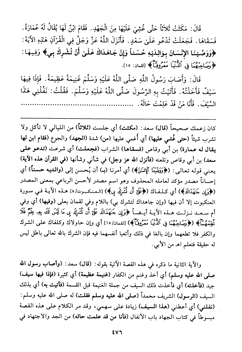 كان زعمك صحيحًا (قال) سعد: (مكثت) أي جلست (ثلاثًا) من الليالي لا تأكل ولا تشرب شيئًا (حتى غُشي عليها) أي أُغمي عليها (من) شدة (الجهد) والجوع (فقام ابن لها يقال له عمارة) بن أبي وقاص (فسقاها) الشراب (فجعلت) أي شرعت (تدعو على سعد) بن أبي وقاص وتلعنه (فأنزل الله عزَّ وجلَّ) في شأني وشأنها (في القرآن هذه الآية) يعني قوله تعالى: {وَوَصَّينَا الْإِنْسَانَ} أي أمرنا (بـ) أن يُحسن إلى (والديه حسنًا) أي إحسانًا مصدر مؤكد لعامله المحذوف وهو اسم مصدر لأحسن الرباعي بمعنى المصدر ({وَإِنْ جَاهَدَاكَ} أي كلفاك {عَلَى أَنْ تُشْرِكَ بِي} [العنكبوت / ٨] هذه الآية في سورة العنكبوت إلا أن فيها {وَإِنْ جَاهَدَاكَ لِتُشْرِكَ بِي} باللام وفي لقمان بعلى (وفيها) أي وفي أم سعد نزلت هذه الآية أيضًا {وَإِنْ جَاهَدَاكَ عَلَى أَنْ تُشْرِكَ بِي مَا لَيسَ لَكَ بِهِ عِلْمٌ فَلَا تُطِعْهُمَا} ({وَصَاحِبْهُمَا فِي الدُّنْيَا مَعْرُوفًا} [لقمان: ١٥] أي وإن حاولاك وكلفاك على الشرك والكفر فلا تطعهما وإن بالغا في ذلك وأتعبا أنفسهما فيه فإن الشرك بالله تعالى باطل ليس له حقيقة فتعلم اهـ من الأبي.
