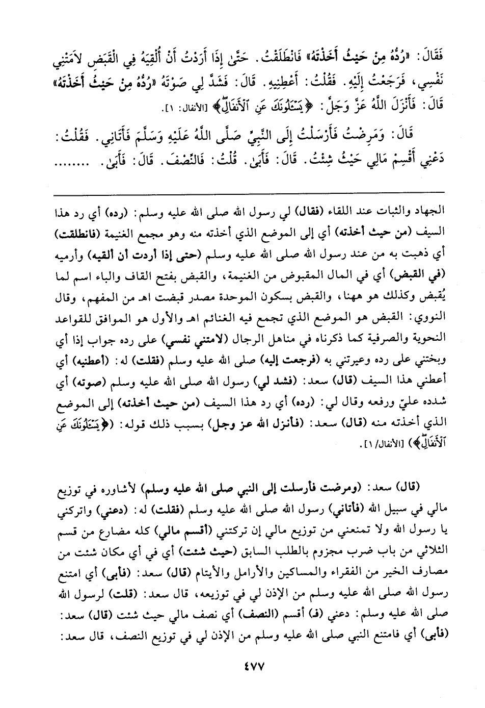 الجهاد والثبات عند اللقاء (فقال) لي رسول الله صلى الله عليه وسلم: (رده) أي رد هذا السيف (من حيث أخدته) أي إلى الموضع الذي أخذته منه وهو مجمع الغنيمة (فانطلقت) أي ذهبت به من عند رسول الله صلى الله عليه وسلم (حتى إذا أردت أن ألقيه) وأرميه (في القبض) أي في المال المقبوض من الغنيمة، والقبض بفتح القاف والباء اسم لما يُقبض وكذلك هو ها هنا، والقبض بسكون الموحدة مصدر قبضت اهـ من المفهم، وقال النووي: القبض هو الموضع الذي تجمع فيه الغنائم اهـ والأول هو الموافق للقواعد النحوية والصرفية كما ذكرناه في مناهل الرجال (لامتني نفسي) على رده جواب إذا أي وبختني على رده وعيرتني به (فرجعت إليه) صلى الله عليه وسلم (فقلت) له: (أعطنيه) أي أعطني هذا السيف (قال) سعد: (فشد لي) رسول الله صلى الله عليه وسلم (صوته) أي شدده علي ورفعه وقال لي: (رده) أي رد هذا السيف (من حيث أخذته) إلى الموضع الذي أخذته منه (قال) سعد: (فأنزل الله عزَّ وجلَّ) بسبب ذلك قوله: {يَسْأَلُونَكَ عَنِ الْأَنْفَالِ} [الأنفال: ١].