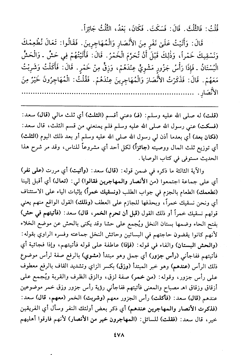 والآية الثالثة ما ذكره في ضمن قوله: (قال) سعد: (وأتيت) أي مررت (على نفر) أي على جماعة اجتمعوا (من الأنصار والمهاجرين فقالوا) لي: (تعال) أي أقبل إلينا (نطعمك) الطعام بالجزم في جواب الطلب (ونسقيك خمرًا) بإثبات الياء على الاستئناف أي ونحن نسقيك خمرًا، وبحذفها للجازم على العطف (وذلك) القول الواقع منهم يعني قولهم نسقيك خمرًا أو ذلك القول (قبل أن تحرم الخمر، قال) سعد: (فأتيتهم في حش) بفتح الحاء وضمها بستان النخل ويُجمع على حشا وقد يكنى بالحش عن موضع الخلاء لأنهم كانوا يقضون حاجتهم في البساتين وحائش النخل جماعته وفسره الراوي بقوله: (والحش البستان) والفاء في قوله: (فإذا) عاطفة على قوله فأتيتهم، وإذا فجائية أي فاتيتهم ففاجأني (رأس جزور) أي جمل وهو مبتدأ (مشوي) بالرفع صفة لرأس موضوع ذلك الرأس (عندهم) وهو خبر المبتدأ (وزق) بكسر الزاي وتشديد القاف بالرفع معطوف على رأس جزور، وقوله: (من خمر) صفة لزق، والزق الظرف والقربة ويُجمع على أزقاق وزقاق اهـ مصباح والمعنى فأتيتهم ففاجأني رؤية رأس جزور وزق خمر موضوعين عندهم (قال) سعد: (فأكلت) رأس الجزور معهم (وشربت) الخمر (معهم، قال) سعد: (فذكرت الأنصار والمهاجرين عندهم) أي ذكر بعض أولئك النفر وسأل أي الفريقين خير، قال سعد: (فقلت) للسائل: (المهاجرون خير من الأنصار) لأنهم فارقوا أهليهم
