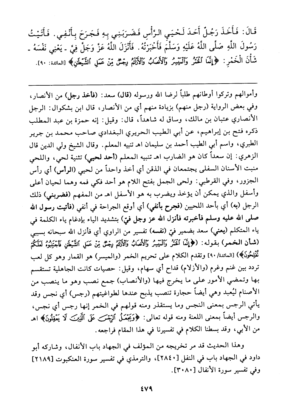 قَال: فَأَخَذَ رَجُلٌ أحَدَ لَحْيَيِ الرَّأْسِ فَضَرَبَنِي بِهِ فَجَرَحَ بِأَنْفِي. فَأَتَيتُ رَسُولَ اللهِ صَلَّى اللهُ عَلَيهِ وَسَلَّمَ فَأخْبَرْتُهُ. فَأَنزَلَ اللهُ عَزَّ وَجَلَّ فِيَّ -يَعْنِي نَفْسَهُ- شَأْنَ الْخَمْرِ: {إِنَّمَا الْخَمْرُ وَالْمَيسِرُ وَالْأَنْصَابُ وَالْأَزْلَامُ رِجْسٌ مِنْ عَمَلِ الشَّيطَانِ} [المائدة: ٩٠]