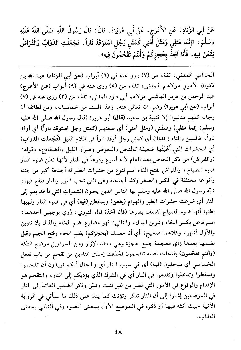 عَنْ أَبِي الزَّنَادِ، عَنِ الأَعْرَجِ، عَنْ أَبِي هُرَيرَةَ. قَال: قَال رَسُولُ اللهِ صَلَّى اللهُ عَلَيهِ وَسَلَّمَ: "إِنَّمَا مَثَلِي وَمَثَلُ أُمَّتِي كَمَثَلِ رَجُلٍ اسْتَوْقَدَ نَارًا. فَجَعَلَتِ الدَّوَابُّ وَالْفَرَاشُ يَقَعْنَ فِيهِ، فَأَنَا آخِذٌ بِحُجَزِكُمْ وَأَنْتُمْ تَقَحَّمُونَ فِيهِ"