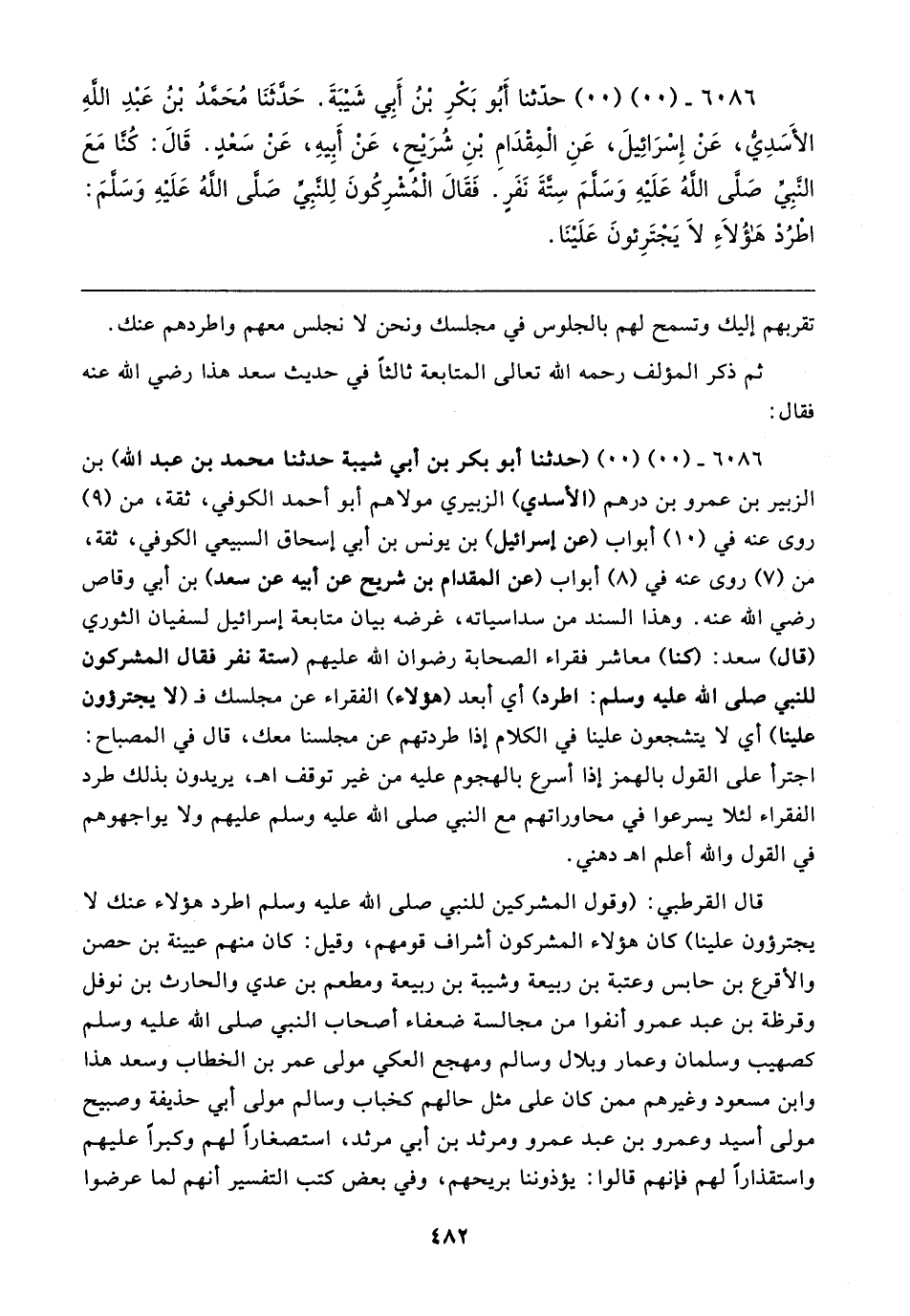 ٦٠٨٦ - (٠٠) (٠٠) حدَّثنا أبُو بَكْرِ بْنُ أَبِي شَيبَةَ. حَدَّثَنَا مُحَمَّدُ بْنُ عَبْدِ اللهِ الأسَدِيُّ، عَنْ إِسْرَائِيلَ، عَنِ الْمِقْدَامِ بْنِ شُرَيحٍ، عَنْ أَبِيهِ، عَنْ سَعْدٍ. قَال: كُنَّا مَعَ النَّبِيِّ صَلَّى اللهُ عَلَيهِ وَسَلَّمَ سِتَّةَ نَفَرٍ. فَقَال الْمُشْرِكُونَ لِلنَّبِيِّ صَلَّى اللهُ عَلَيهِ وَسَلَّمَ: اطْرُدْ هَؤُلاءِ لَا يَجْتَرِئونَ عَلَينَا