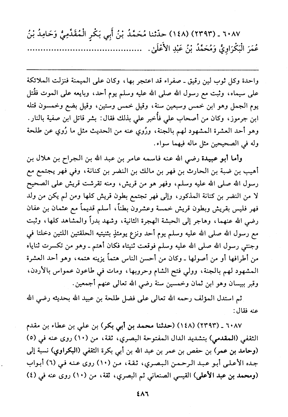 ٦٠٨٧ - (٢٣٩٣) (١٤٨) (حدثنا محمد بن أبي بكر) بن علي بن عطاء بن مقدم الثقفي (المقدمي) بتشديد الدال المفتوحة البصري، ثقة، من (١٠) روى عنه في (٥) (وحامد بن عمر) بن حفص بن عمر بن عبد الله بن أبي بكرة الثقفي (البكراوي) نسبة إلى جده الأعلى أبو عبد الرحمن البصري، ثقة، من (١٠) روى عنه في (٦) أبواب (ومحمد بن عبد الأعلى) القيسي الصنعاني ثم البصري، ثقة، من (١٠) روى عنه في (٤)