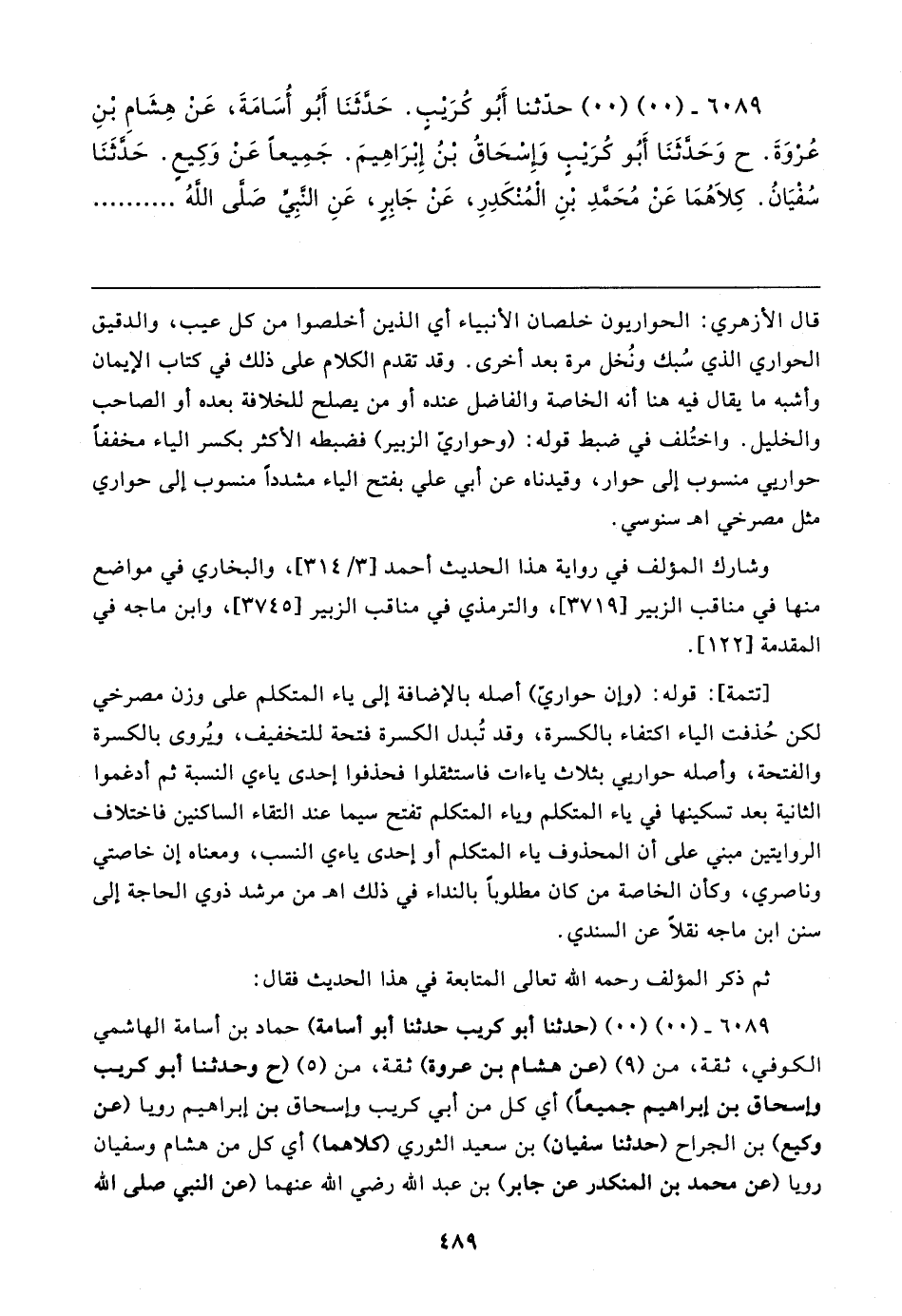 ٦٠٨٩ - (٠٠) (٠٠) (حدثنا أبو كريب حدثنا أبو أسامة) حماد بن أسامة الهاشمي الكوفي، ثقة، من (٩) (عن هشام بن عروة) ثقة، من (٥) (ح وحدثنا أبو كريب وإسحاق بن إبراهيم جميعًا) أي كل من أبي كريب وإسحاق بن إبراهيم رويا (عن وكيع) بن الجراح (حدثنا سفيان) بن سعيد الثوري (كلاهما) أي كل من هشام وسفيان رويا (عن محمد بن المنكدر عن جابر) بن عبد الله رضي الله عنهما (عن النبي صلى الله