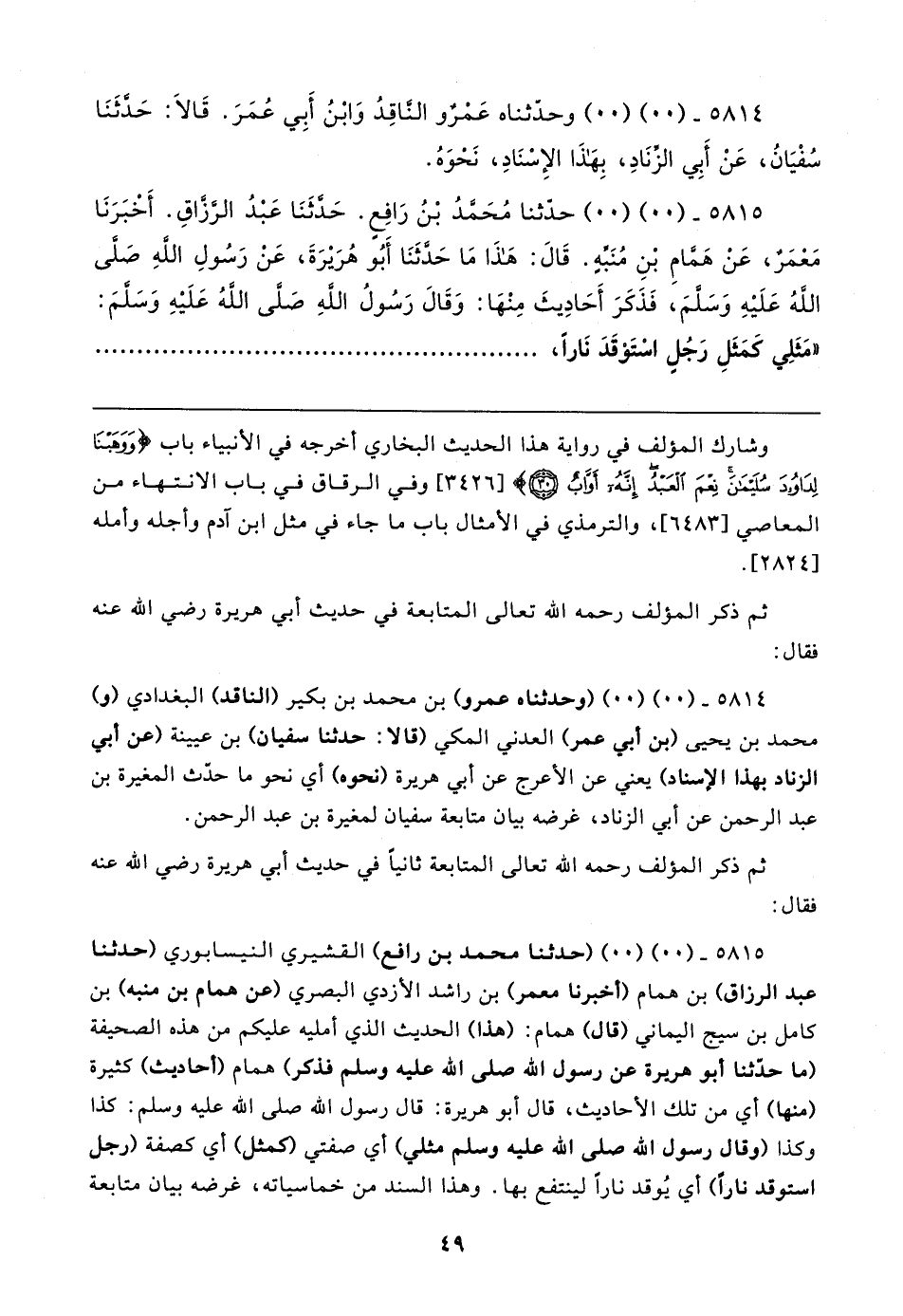 ٥٨١٥ - (٠٠) (٠٠) (حَدَّثَنَا محمد بن رافع) القشيري النيسابوري (حَدَّثَنَا عبد الرزاق) بن همام (أخبرنا معمر) بن راشد الأزدي البصري (عن همام بن منبه) بن كامل بن سيج اليماني (قال) همام: (هذا) الحديث الَّذي أمليه عليكم من هذه الصحيفة (ما حدَّثنا أبو هريرة عن رسول الله صلى الله عليه وسلم فذكر) همام (أحاديث) كثيرة (منها) أي من تلك الأحاديث، قال أبو هريرة: قال رسول الله صلى الله عليه وسلم: كذا وكذا (وقال رسول الله صلى الله عليه وسلم مثلي) أي صفتي كمثل) أي كصفة (رجل استوقد نارًا) أي يُوقد نارًا لينتفع بها. وهذا السند من خماسياته، غرضه بيان متابعة