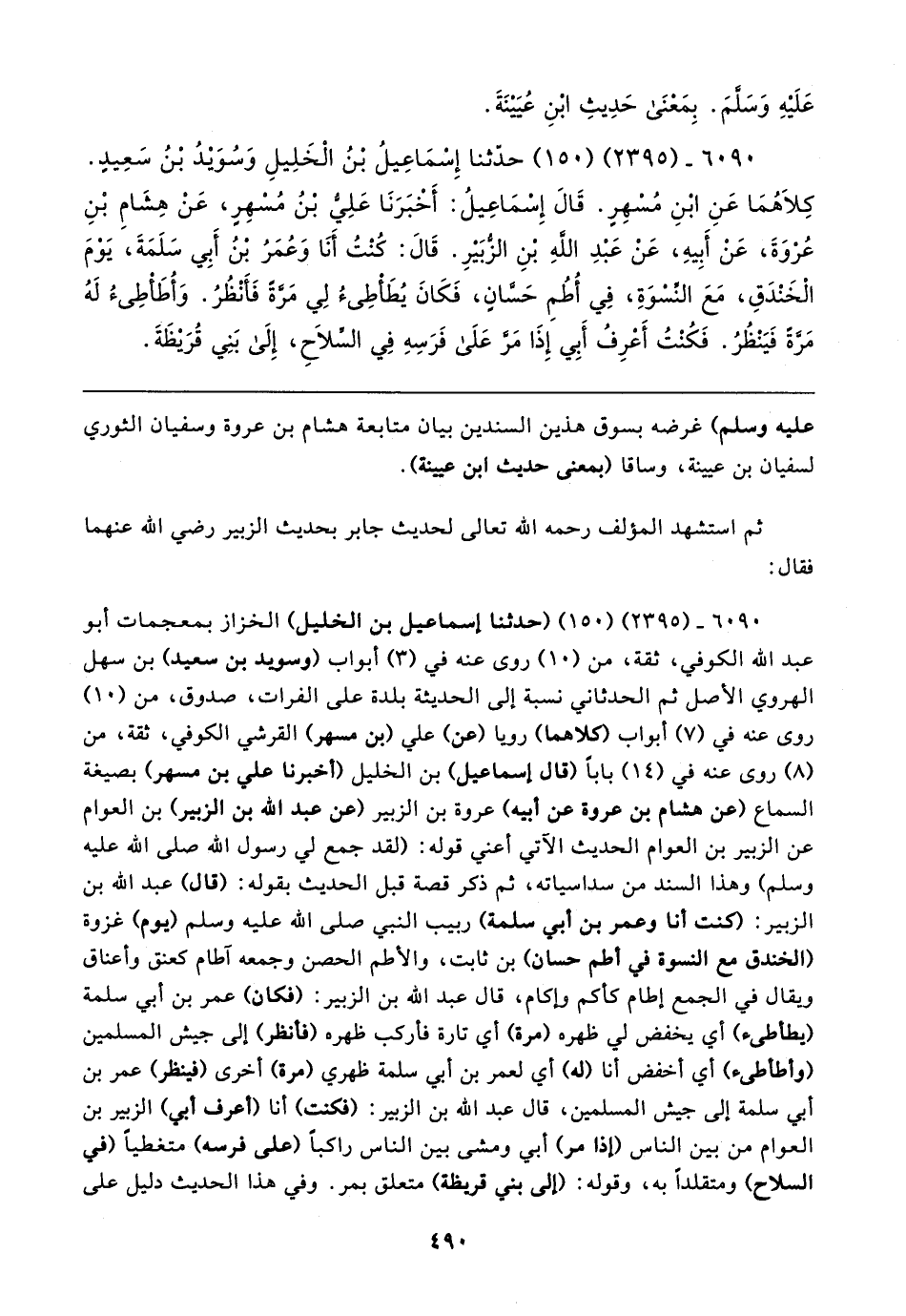 ٦٠٩٥ - (٢٣٩٥) (١٥٠) حدَّثنا إِسْمَاعِيلُ بْنُ الْخَلِيلِ وَسُوَيدُ بْنُ سَعِيدٍ. كِلاهُمَا عَنِ ابْنِ مُسْهِرٍ. قَال إِسْمَاعِيلُ: أَخْبَرَنَا عَلِيُّ بْنُ مُسْهِرٍ، عَنْ هِشَامِ بْنِ عُرْوَةَ، عَنْ أَبِيهِ، عَنْ عَبْدِ اللهِ بْنِ الزُّبَيرِ. قَال: كُنْتُ أَنَا وَعُمَرُ بْنُ أَبِي سَلَمَةَ، يَوْمَ الْخَنْدَقِ، مَعَ النِّسْوَةِ، فِي أُطُمِ حَسَّانٍ، فَكَانَ يُطَأْطِئُ لِي مَرَّةً فَأَنْظُرُ. وَأُطَأْطِئُ لَهُ مَرَّةَ فَيَنْظُرُ. فَكُنْتُ أَعْرِفُ أَبِي إِذَا مَرَّ عَلَى فَرَسِهِ فِي السِّلاحِ، إِلَى بَنِي قُرَيظَةَ