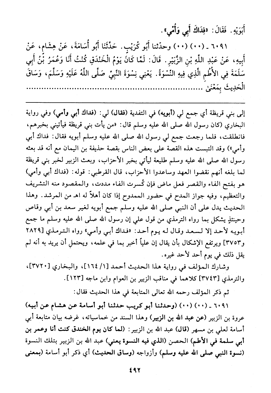 ٦٠٩١ - (٠٠) (٠٠) وحدّثنا أَبُو كُرَيبٍ. حَدَّثَنَا أَبُو أُسَامَةَ، عَنْ هِشَامٍ، عَنْ أَبِيهِ، عَنْ عَبْدِ اللهِ بْنِ الزُّبَيرِ. قَال: لَمَّا كَانَ يَوْمُ الْخَنْدَقِ كُنْتُ أَنَا وَعُمَرُ بْنُ أَبِي سَلَمَةَ فِي الأُطُمِ الَّذِي فِيهِ النِّسْوَةُ. يَعْنِي نِسْوَةَ النَّبِيِّ اللهِ صَلَّى اللهُ عَلَيهِ وَسَلَّمَ، وَسَاقَ الْحَدِيثَ بِمَعْنَى