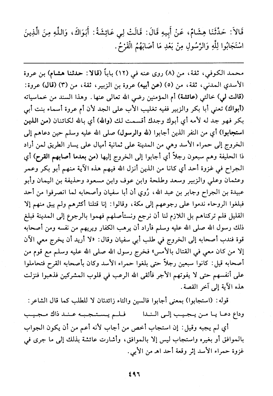 محمد الكوفي، ثقة، من (٨) روى عنه في (١٢) بابا (قالا: حدثنا هشام) بن عروة الأسدي المدني، ثقة، من (٥) (عن أبيه) عروة بن الزبير، ثقة، من (٣) (قال) عروة: (قالت لي) خالتي (عائشة) أم المؤمنين رضي الله تعالى عنها. وهذا السند من خماسياته (أبواك) تعني أبا بكر والزبير ففيه تغليب الأب على الجد لأن أم عروة أسماء بنت أبي بكر فهو جد له لأمه أي أبوك وجدك أقسمت لك (والله) أي بالله لكائنان (من الذين استجابوا) أي من النفر الذين أجابوا (لله والرسول) صلى الله عليه وسلم حين دعاهم إلى الخروج إلى حمراء الأسد وهي من المدينة على ثمانية أميال على يسار الطريق لمن أراد ذا الحليفة وهم سبعون رجلًا أي أجابوا إلى الخروج إليها (من بعدما أصابهم القرح) أي الجراح في غزوة أحد أي كانا من الذين أنزل الله فيهم هذه الآية منهم أبو بكر وعمر وعثمان وعلي والزبير وسعد وطلحة وابن عوف وابن مسعود وحذيفة بن اليمان وأبو عبيدة بن الجراح وجابر بن عبد الله، رُوي أن أبا سفيان وأصحابه لما انصرفوا من أحد فبلغوا الروحاء ندموا على رجوعهم إلى مكة، وقالوا: إنا قتلنا أكثرهم ولم يبق منهم إلا القليل فلم تركناهم بل اللازم لنا أن نرجع ونستأصلهم فهموا بالرجوع إلى المدينة فبلغ ذلك رسول الله صلى الله عليه وسلم فأراد أن يرهب الكفار ويريهم من نفسه ومن أصحابه قوة فندب أصحابه إلى الخروج في طلب أبي سفيان وقال: "لا أريد أن يخرج معي الآن إلا من كان معي في القتال بالأمس" فخرج رسول الله صلى الله عليه وسلم مع قوم من أصحابه قيل: كانوا سبعين رجلًا حتى بلغوا حمراء الأسد وكان بأصحابه القرح فتحاملوا على أنفسهم حتى لا يفوتهم الأجر فألقى الله الرعب في قلوب المشركين فذهبوا فنزلت هذه الآية إلى آخر القصة.