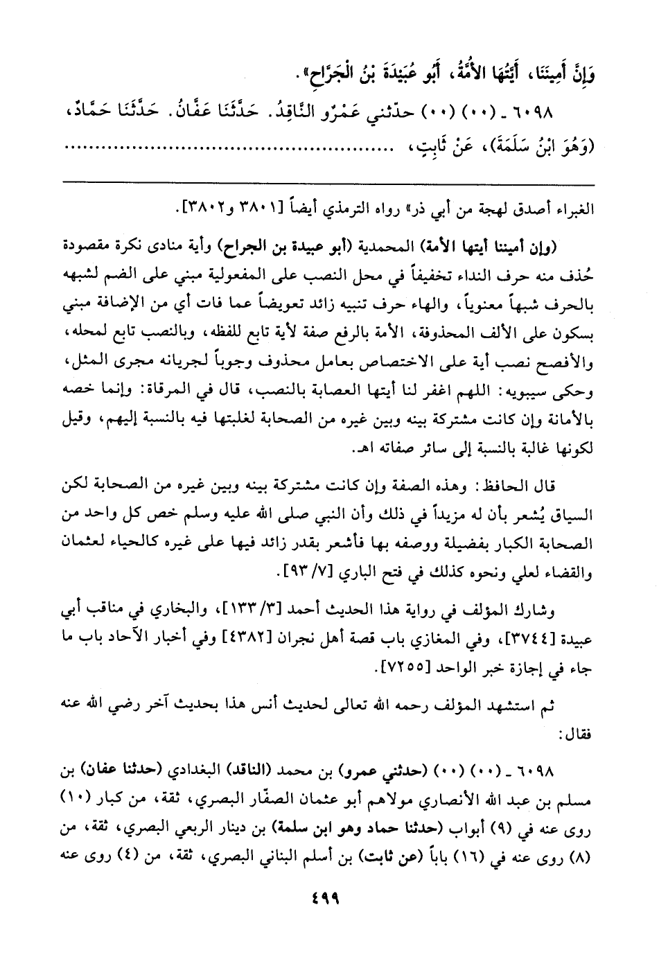 ٦٠٩٨ - (٠٠) (٠٠) (حدثني عمرو) بن محمد (الناقد) البغدادي (حدثنا عفان) بن مسلم بن عبد الله الأنصاري مولاهم أبو عثمان الصفّار البصري، ثقة، من كبار (١٠) روى عنه في (٩) أبواب (حدثنا حماد وهو ابن سلمة) بن دينار الربعي البصري، ثقة، من (٨) روى عنه في (١٦) بابا (عن ثابت) بن أسلم البناني البصري، ثقة، من (٤) روى عنه