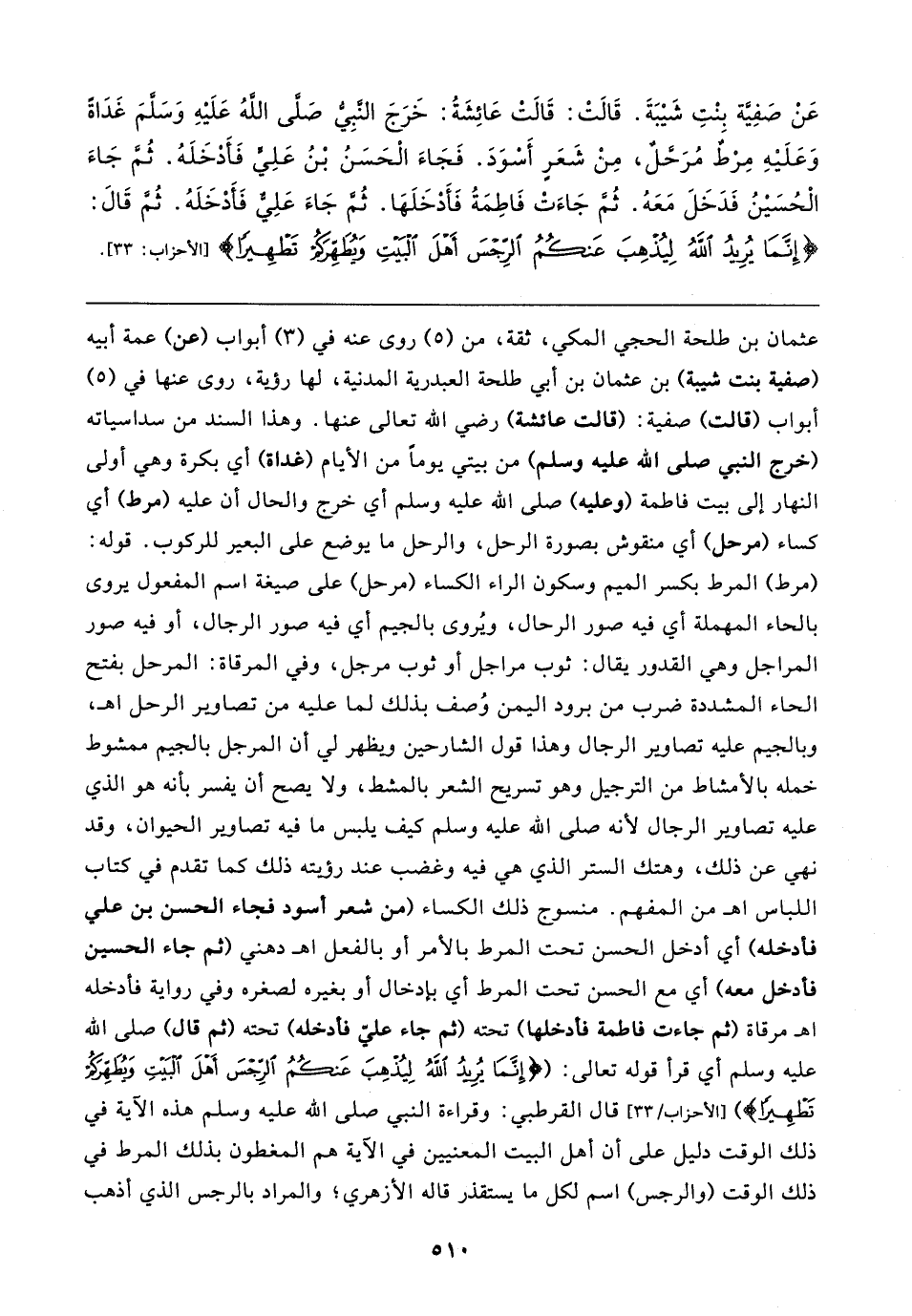 عَنْ صَفِيَّة بنْتِ شَيبَةَ. قَالتْ: قَالتْ عَائِشَةُ: خَرَجَ النَّبِيُّ صَلَّى اللهُ عَلَيهِ وَسَلَّمَ غَدَاةً وَعَلَيهِ مِرْطٌ مُرَحَّلٌ، مِنْ شَعَرٍ أَسْوَدَ. فَجَاءَ الْحَسَنُ بْنُ عَلِيٍّ فَأَدْخَلَهُ. ثُمَّ جَاءَ الْحُسَينُ فَدَخَلَ مَعَهُ. ثُمَّ جَاءَتْ فَاطِمَةُ فَأَدْخَلَهَا. ثُمَّ جَاءَ عَلِيٌّ فَأَدْخَلَهُ. ثُمَّ قَال: {إِنَّمَا يُرِيدُ اللَّهُ لِيُذْهِبَ عَنْكُمُ الرِّجْسَ أَهْلَ الْبَيتِ وَيُطَهِّرَكُمْ تَطْهِيرًا} [الأحزاب: ٣٣]