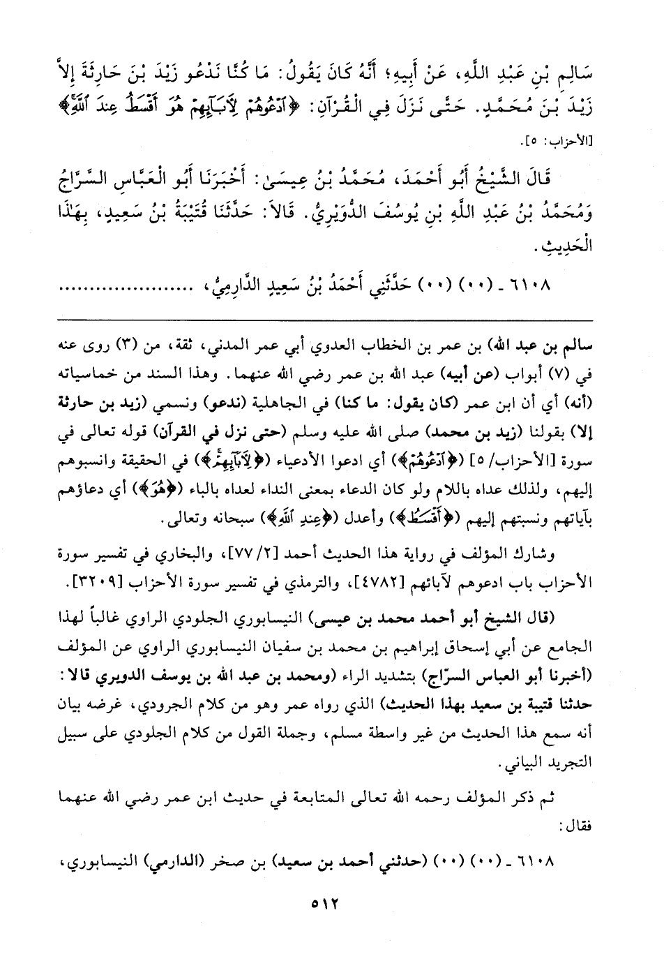 سَالِمِ بْنِ عَبْدِ اللهِ، عَنْ أبِيهِ؛ أنَّهُ كَانَ يَقُولُ: مَا كُنَّا نَدْعُو زَيدَ بْنَ حَارِثَةَ إِلَّا زَيدَ بْنَ مُحَمَّدٍ. حَتَّى نَزَلَ فِي الْقُرْآنِ: {ادْعُوهُمْ لِآبَائِهِمْ هُوَ أَقْسَطُ عِنْدَ اللَّهِ} [الأحزاب: ٥].
