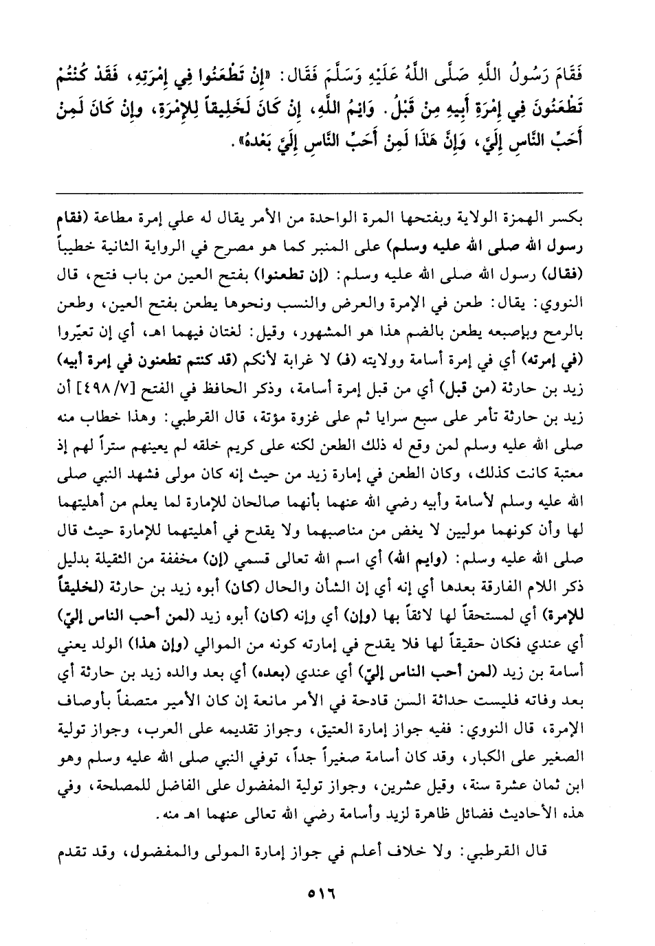 فَقَامَ رَسُولُ اللهِ صَلَّى اللهُ عَلَيهِ وَسَلَّمَ فَقَال: "إِنْ تَطعَنُوا فِي إِمْرَتِهِ، فَقَدْ كُنْتُمْ تَطْعَنُونَ فِي إِمْرَةِ أَبِيهِ مِنْ قَبْلُ. وَايمُ اللهِ، إِنْ كَانَ لَخَلِيقًا لِلأمْرَةِ، وإِنْ كَانَ لَمِنْ أَحَبِّ النَّاسِ إِلَيَّ، وإِنَّ هَذَا لَمِنْ أَحَبِّ النَّاسِ إِلَيَّ بَعْدهُ"