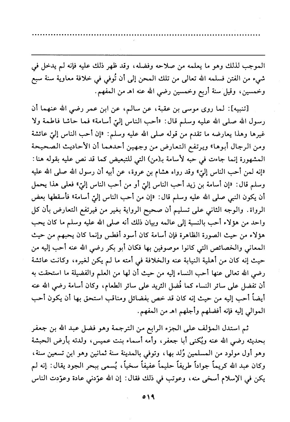 [تنبيه]: لما روى موسى بن عقبة، عن سالم، عن ابن عمر رضي الله عنهما أن رسول الله صلى الله عليه وسلم قال: "أحب الناس إليّ أسامة" فما حاشا فاطمة ولا غيرها وهذا يعارضه ما تقدم من قوله صلى الله عليه وسلم: "إن أحب الناس إليّ عائشة ومن الرجال أبوها" ويرتفع التعارض من وجهين أحدهما أن الأحاديث الصحيحة المشهورة إنما جاءت في حبه لأسامة ب (من) التي للتبعيض كما قد نص عليه بقوله هنا: "إنه لمن أحب الناس إليّ" وقد رواه هشام بن عروة، عن أبيه أن رسول الله صلى الله عليه وسلم قال: "إن أسامة بن زيد أحب الناس إليّ أو من أحب الناس إليّ" فعلى هذا يحمل أن يكون النبي صلى الله عليه وسلم قال: "إن من أحب الناس إليّ أسامة" فأسقطها بعض الرواة. والوجه الثاني على تسليم أن صحيح الرواية بغير من فيرتفع التعارض بأن كل واحد من هؤلاء أحب بالنسبة إلى عالمه وبيان ذلك أنه صلى الله عليه وسلم ما كان يحب هؤلاء من حيث الصورة الظاهرة فإن أسامة كان أسود أفطس وإنما كان يحبهم من حيث المعاني والخصائص التي كانوا موصوفين بها فكان أبو بكر رضي الله عنه أحب إليه من حيث إنه كان من أهلية النيابة عنه والخلافة في أمته ما لم يكن لغيره، وكانت عائشة رضي الله تعالى عنها أحب النساء إليه من حيث أن لها من العلم والفضيلة ما استحقت به أن تفضل على سائر النساء كما فُضل الثريد على سائر الطعام، وكان أسامة رضي الله عنه أيضًا أحب إليه من حيث إنه كان قد خص بفضائل ومناقب استحق بها أن يكون أحب الموالي إليه فإنه أفضلهم وأجلهم اهـ من المفهم.