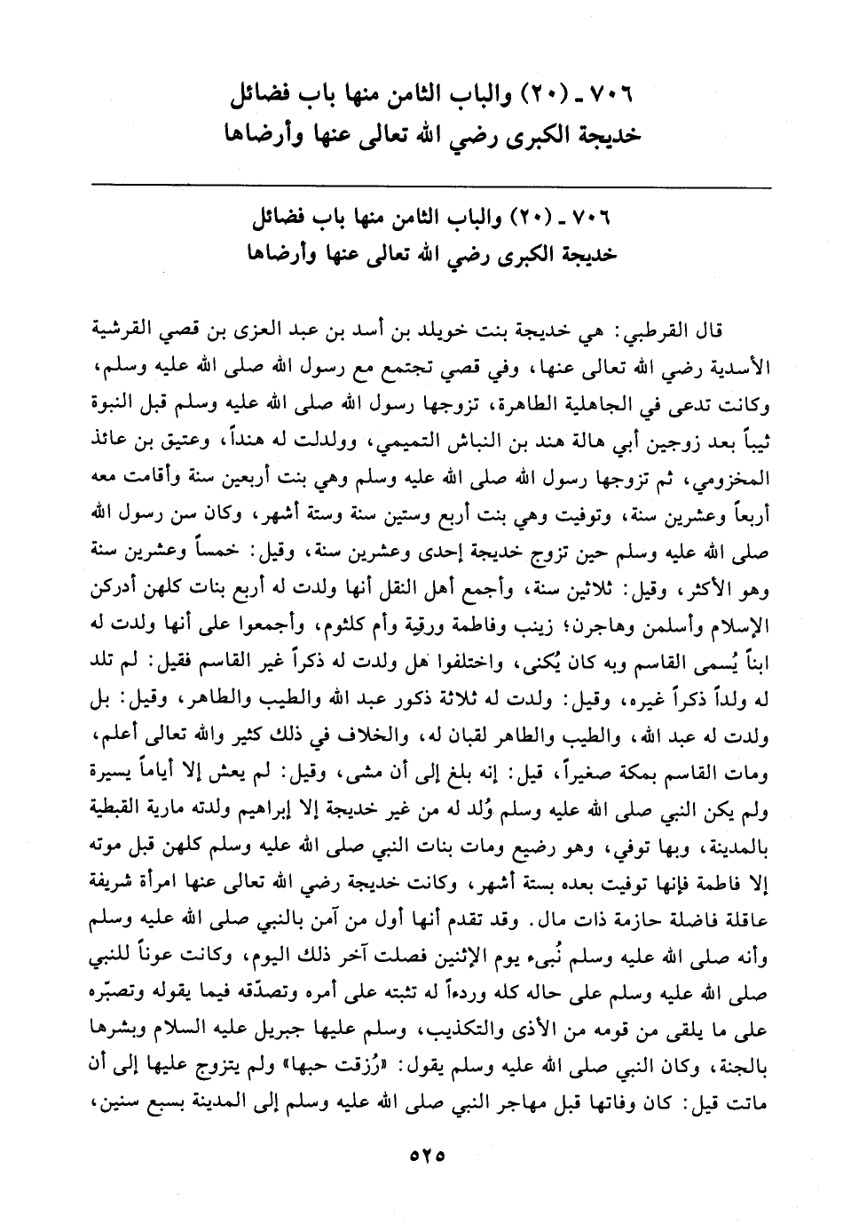 ٧٠٦ - (٢٠) والباب الثامن منها باب فضائل خديجة الكبرى رضي الله تعالى عنها وأرضاها