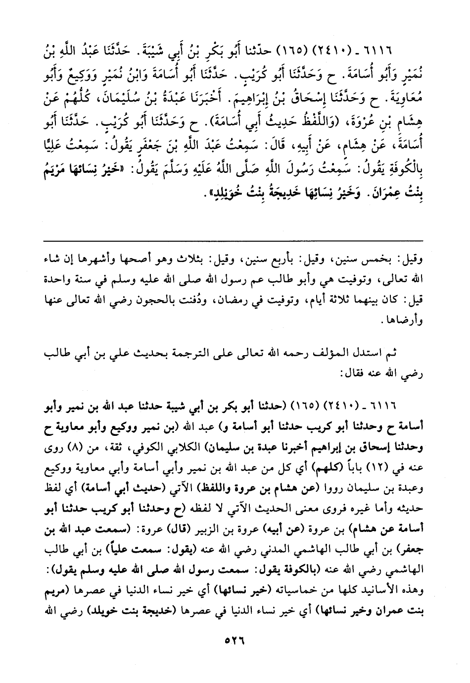 ٦١١٦ - (٢٤١٠) (١٦٥) حدَّثنا أَبُو بَكرِ بْنُ أَبِي شَيبَةَ. حَدَّثَنَا عَبْدُ اللهِ بْنُ نُمَيرٍ وَأَبُو أُسَامَةَ. ح وَحَدَّثَنَا أَبُو كُرَيبٍ. حَدَّثَنَا أَبُو أُسَامَةَ وَابْنُ نُمَيرٍ وَوَكِيعٌ وَأَبُو مُعَاويةَ. ح وَحَدَّثَنَا إِسْحَاقُ بْنُ إِبْرَاهِيمَ. أَخبَرَنَا عَبْدَةُ بْنُ سُلَيمَانَ، كُلُّهُمْ عَنْ هِشَامِ بْنِ عُرْوَةَ، (وَاللَّفْظُ حَدِيثُ أَبِي أُسَامَةَ). ح وَحَدَّثَنَا أَبُو كُرَيبٍ. حَدَّثَنَا أَبُو أُسَامَةَ، عَنْ هِشَامٍ، عَنْ أبِيهِ، قَال: سَمِعْتُ عَبْدَ اللهِ بْنَ جَعْفَرٍ يَقُولُ: سَمِعْتُ عَلِيًّا بِالْكُوفَةِ يَقُولُ: سَمِعْتُ رَسُولَ اللهِ صَلَّى اللهُ عَلَيهِ وَسَلَّمَ يَقُولُ: "خَيرُ نِسَائهَا مَرْيَمُ بِنْتُ عِمْرَانَ. وَخَيرُ نِسَائِهَا خَدِيجَةُ بِنْتُ خُوَيلِدٍ"
