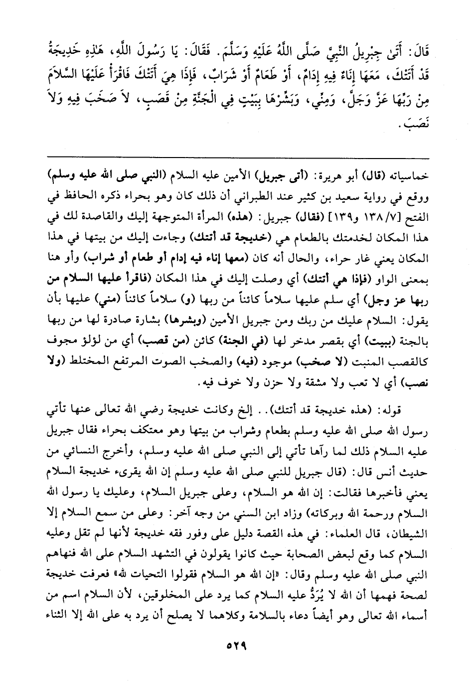 قَال: أَتَى جِبْرِيلُ النبِي صَلَّى اللهُ عَلَيهِ وَسَلَّمَ. فَقَال: يَا رَسُولَ اللهِ، هَذِهِ خَدِيجَةُ قَدْ أَتَتْكَ، مَعَهَا إِنَاءٌ فِيهِ إِدَامٌ، أَوْ طَعَامٌ أَوْ شَرَابٌ، فَإِذَا هِيَ أَتَتْكَ فَاقرَأْ عَلَيهَا السَّلامَ مِنْ رَبِّهَا عَزَّ وَجَلَّ، وَمِنِّي، وَبَشِّرْهَا بِبَيتٍ فِي الْجَنَّةِ مِنْ قَصَبٍ، لَا صَخَبَ فِيهِ وَلَا نَصَبَ