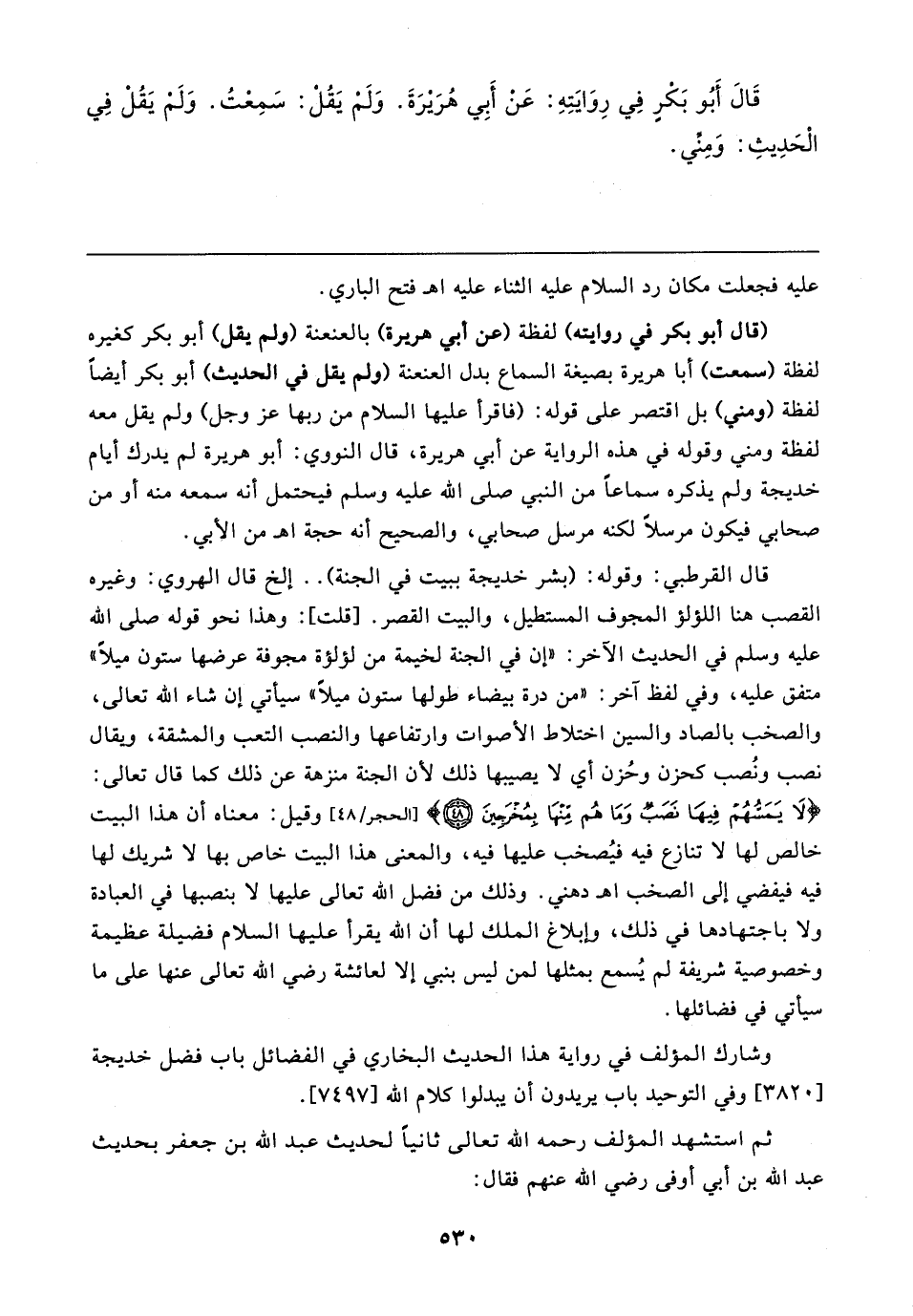 (قال أبو بكر في روايته) لفظة (عن أبي هريرة) بالعنعنة (ولم يقل) أبو بكر كغيره لفظة (سمعت) أبا هريرة بصيغة السماع بدل العنعنة (ولم يقل في الحديث) أبو بكر أيضًا لفظة (ومني) بل اقتصر على قوله: (فاقرأ عليها السلام من ربها عزَّ وجلَّ) ولم يقل معه لفظة ومني وقوله في هذه الرواية عن أبي هريرة، قال النووي: أبو هريرة لم يدرك أيام خديجة ولم يذكره سماعًا من النبي صلى الله عليه وسلم فيحتمل أنه سمعه منه أو من صحابي فيكون مرسلًا لكنه مرسل صحابي، والصحيح أنه حجة اهـ من الأبي.