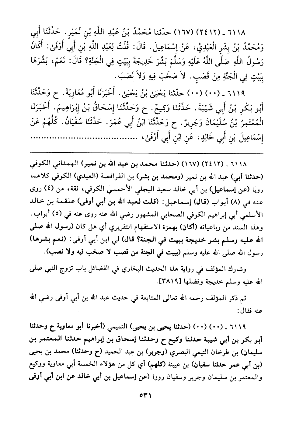 ٦١١٨ - (٢٤١٢) (١٦٧) (حدثنا محمد بن عبد الله بن نمير) الهمداني الكوفي (حدثنا أبي) عبد الله بن نمير (ومحمد بن بشر) بن الفرافصة (العبدي) الكوفي كلاهما رويا (عن إسماعيل) بن أبي خالد سعيد البجلي الأحمسي الكوفي، ثقة، من (٤) روى عنه في (٨) أبواب (قال) إسماعيل: (قلت لعبد الله بن أبي أوفى) علقمة بن خالد الأسلمي أبي إبراهيم الكوفي الصحابي المشهور رضي الله عنه روى عنه في (٥) أبواب. وهذا السند من رباعياته (أكان) بهمزة الاستفهام التقريري أي هل كان (رسول الله صلى الله عليه وسلم بشر خديجة ببيت في الجنة؟ قال) لي ابن أبي أوفى: (نعم بشرها) رسول الله صلى الله عليه وسلم (ببيت في الجنة من قصب لا صخب فيه ولا نصب).
