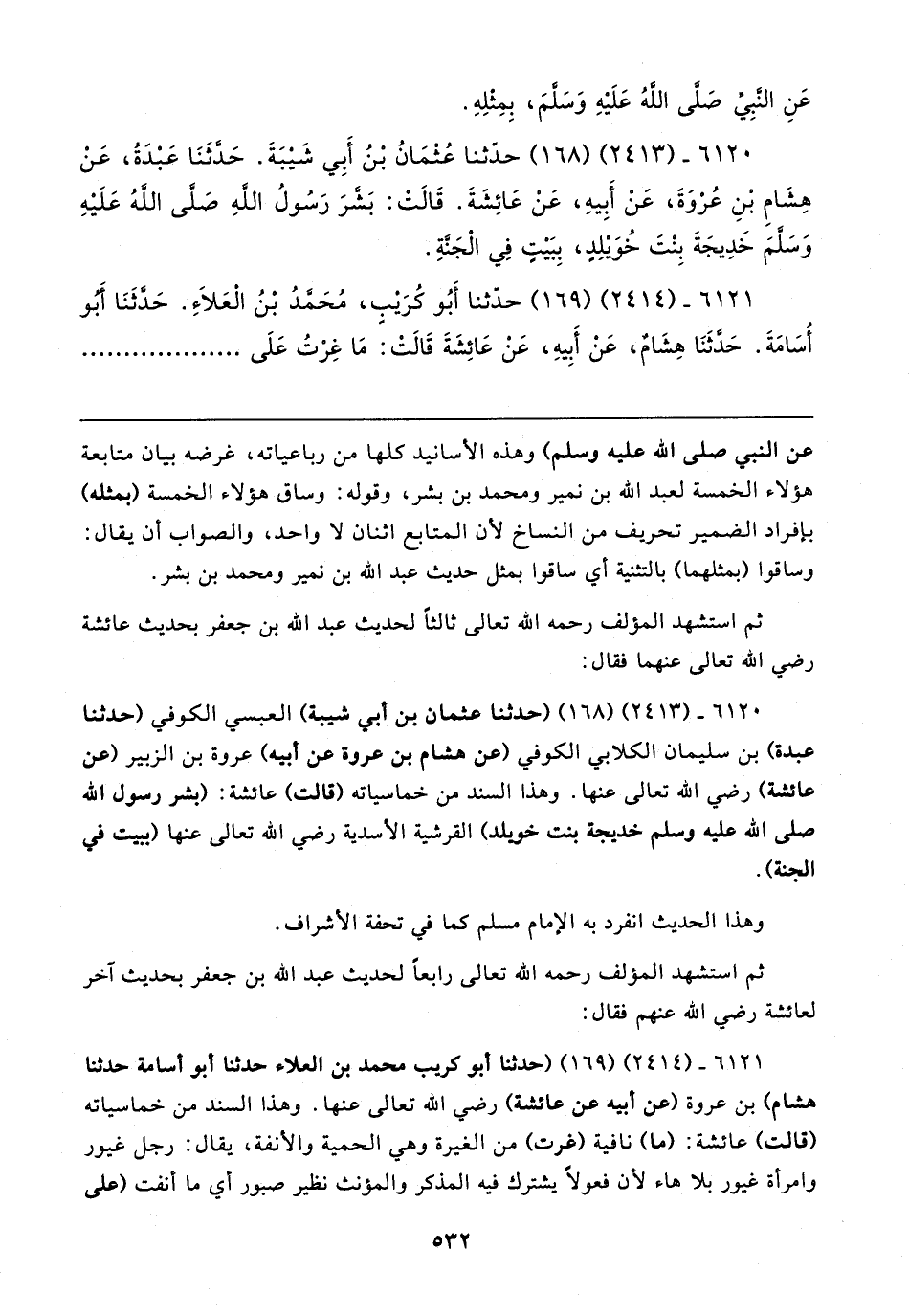 ٦١٢٠ - (٢٤١٣) (١٦٨) (حدثنا عثمان بن أبي شيبة) العبسي الكوفي (حدثنا عبدة) بن سليمان الكلابي الكوفي (عن هشام بن عروة عن أبيه) عروة بن الزبير (عن عائشة) رضي الله تعالى عنها. وهذا السند من خماسياته (قالت) عائشة: (بشر رسول الله صلى الله عليه وسلم خديجة بنت خويلد) القرشية الأسدية رضي الله تعالى عنها (ببيت في الجنة).