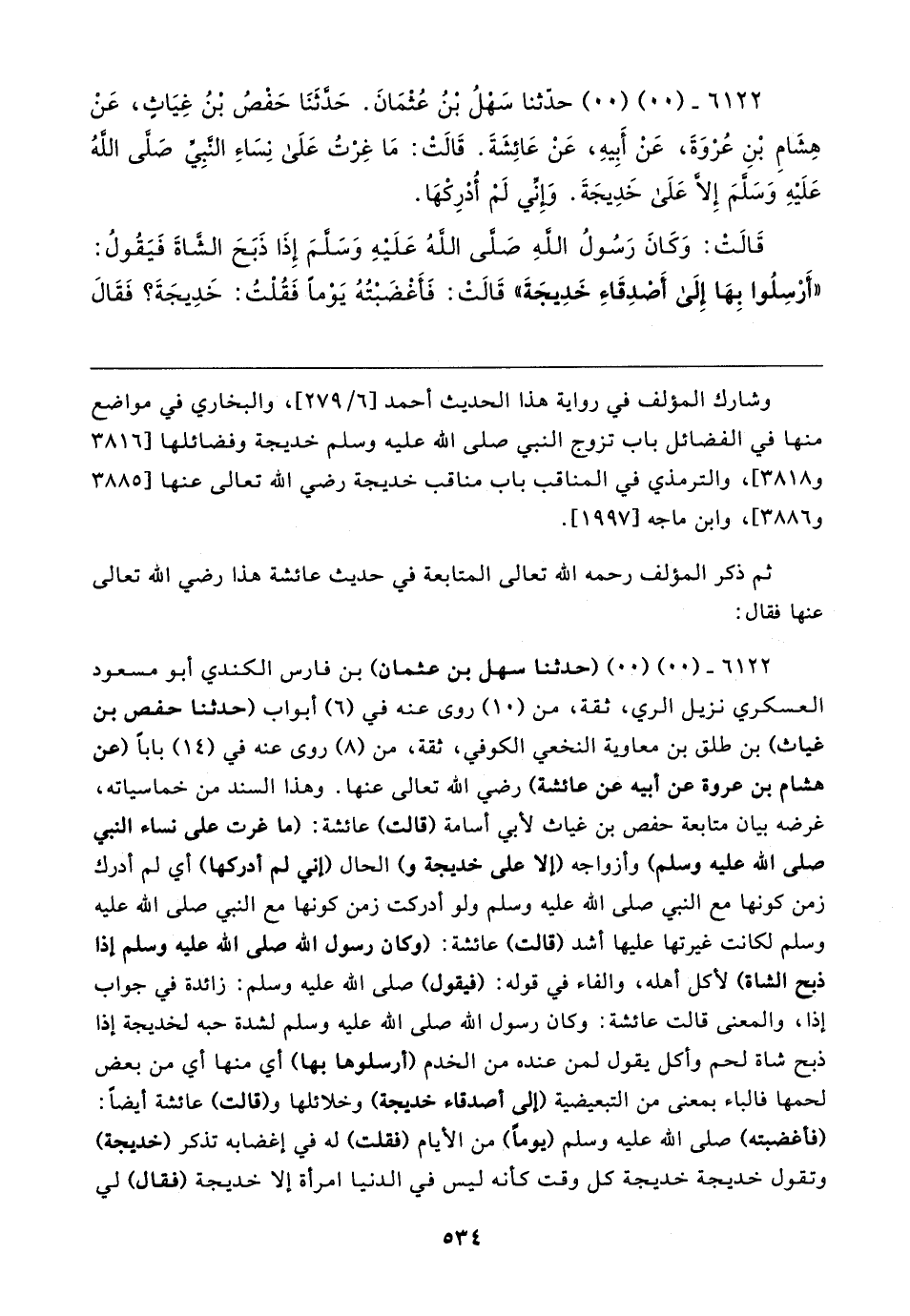 ٦١٢٢ - (٠٠) (٠٠) (حدثنا سهل بن عثمان) بن فارس الكندي أبو مسعود العسكري نزيل الري، ثقة، من (١٠) روى عنه في (٦) أبواب (حدثنا حفص بن غياث) بن طلق بن معاوية النخعي الكوفي، ثقة، من (٨) روى عنه في (١٤) بابا (عن هشام بن عروة عن أبيه عن عائشة) رضي الله تعالى عنها. وهذا السند من خماسياته، غرضه بيان متابعة حفص بن غياث لأبي أسامة (قالت) عائشة: (ما غرت على نساء النبي صلى الله عليه وسلم) وأزواجه (إلا على خديجة و) الحال (إني لم أدركها) أي لم أدرك زمن كونها مع النبي صلى الله عليه وسلم ولو أدركت زمن كونها مع النبي صلى الله عليه وسلم لكانت غيرتها عليها أشد (قالت) عائشة: (وكان رسول الله صلى الله عليه وسلم إذا ذبح الشاة) لأكل أهله، والفاء في قوله: (فيقول) صلى الله عليه وسلم: زائدة في جواب إذا، والمعنى قالت عائشة: وكان رسول الله صلى الله عليه وسلم لشدة حبه لخديجة إذا ذبح شاة لحم وأكل يقول لمن عنده من الخدم (أرسلوها بها) أي منها أي من بعض لحمها فالباء بمعنى من التبعيضية (إلى أصدفاء خدبجة) وخلائلها و (قالت) عائشة أيضًا: (فأغضبته) صلى الله عليه وسلم (يومًا) من الأيام (فقلت) له في إغضابه تذكر (خديجة) وتقول خديجة خديجة كل وقت كأنه ليس في الدنيا امرأة إلا خديجة (فقال) لي