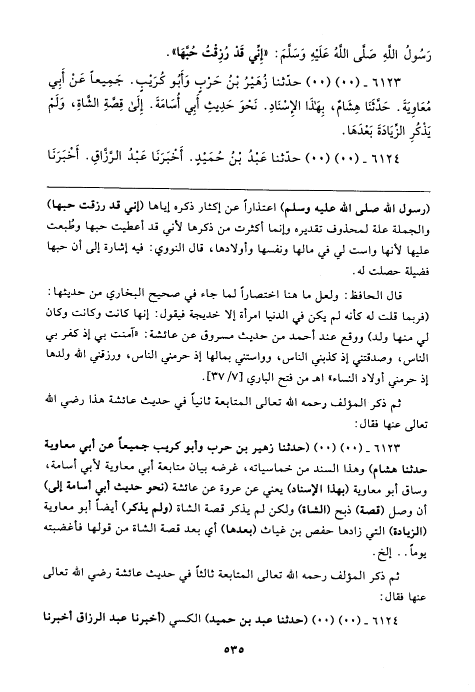 ٦١٢٣ - (٠٠) (٠٠) (حدثنا زهير بن حرب وأبو كريب جميعًا عن أبي معاوية حدثنا هشام) وهذا السند من خماسياته، غرضه بيان متابعة أبي معاوية لأبي أسامة، وساق أبو معاوية (بهذا الإسناد) يعني عن عروة عن عائشة (نحو حديث أبي أسامة إلى) أن وصل (قصة) ذبح (الشاة) ولكن لم يذكر قصة الشاة (ولم يذكر) أيضًا أبو معاوية (الزيادة) التي زادها حفص بن غياث (بعدها) أي بعد قصة الشاة من قولها فأغضبته يومًا .. إلخ.