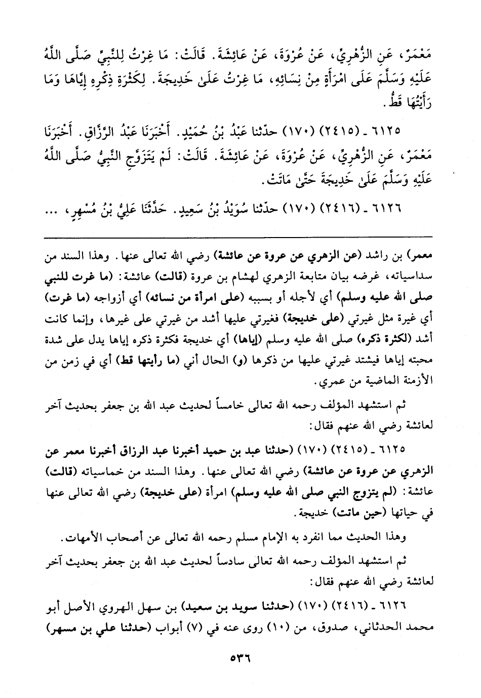 ٦١٢٥ - (٢٤١٥) (١٧٠) (حدثنا عبد بن حميد أخبرنا عبد الرزاق أخبرنا معمر عن الزهري عن عروة عن عائشة) رضي الله تعالى عنها. وهذا السند من خماسياته (قالت) عائشة: (لم يتزوج النبي صلى الله عليه وسلم) امرأة (على خديجة) رضي الله تعالى عنها في حياتها (حين ماتت) خديجة.