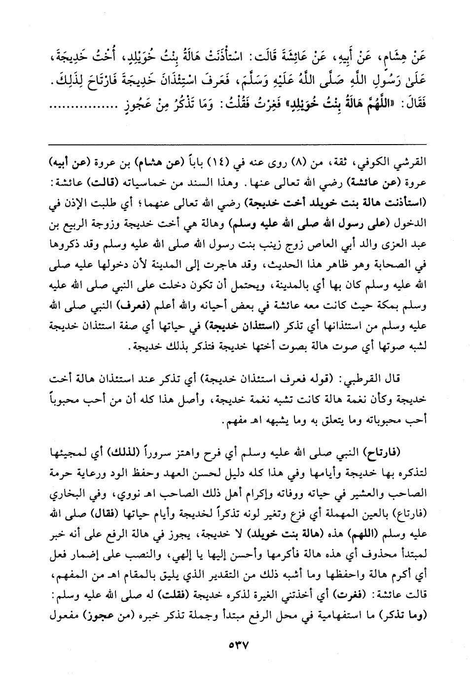 عَنْ هِشَامٍ، عَنْ أَبِيهِ، عَنْ عَائِشَةَ قَالت: اسْتأذَنَتْ هَالةُ بِنْتُ خُوَيلِدٍ، أخْتُ خَدِيجَةَ، عَلَى رَسُولِ اللهِ صَلَّى اللهُ عَلَيهِ وَسَلَّمَ، فَعَرفَ اسْتِئْذَانَ خَدِيجَةَ فَارْتَاحَ لِذَلِكَ. فَقَال: "اللَّهُمَّ هَالةُ بِنْتُ خُوَيلِدٍ" فَغِرْتُ فَقُلْتُ: وَمَا تَذْكُرُ مِنْ عَجُوزٍ