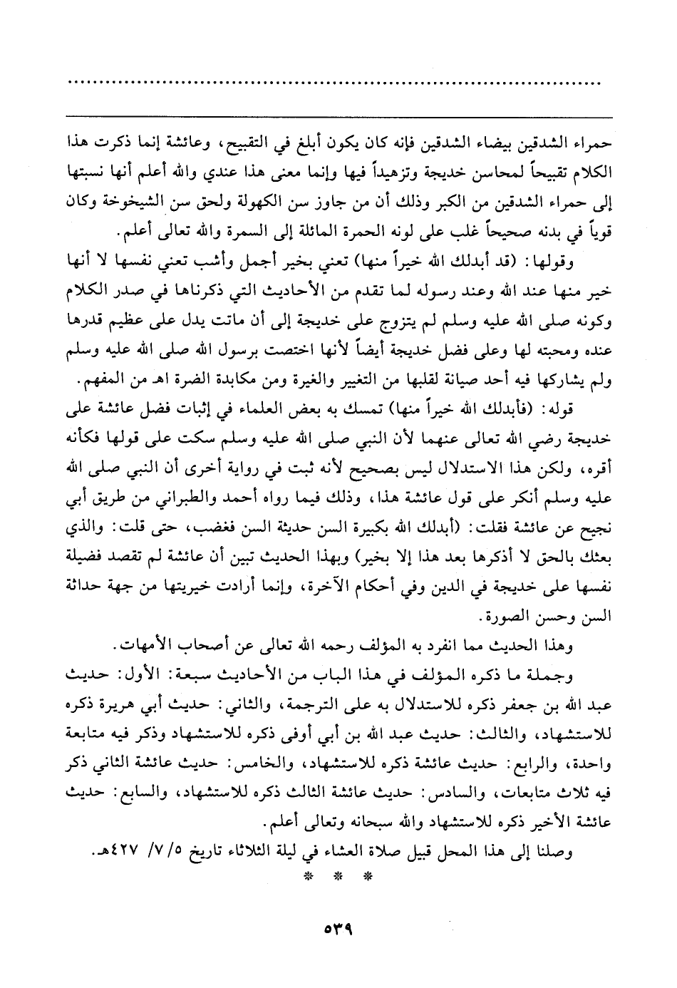 حمراء الشدقين بيضاء الشدقين فإنه كان يكون أبلغ في التقبيح، وعائشة إنما ذكرت هذا الكلام تقبيحًا لمحاسن خديجة وتزهيدًا فيها وإنما معنى هذا عندي والله أعلم أنها نسبتها إلى حمراء الشدقين من الكبر وذلك أن من جاوز سن الكهولة ولحق سن الشيخوخة وكان قويًّا في بدنه صحيحًا غلب على لونه الحمرة المائلة إلى السمرة والله تعالى أعلم.