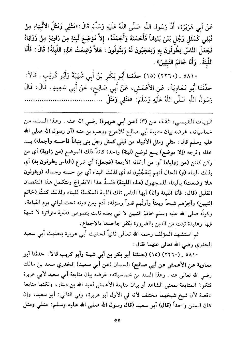 عَنْ أَبِي هُرَيرَة، أَنَّ رَسُولَ اللهِ صَلَّى اللهُ عَلَيهِ وَسَلَّمَ قَال: "مَثَلِي وَمَثَلُ الأَنْبِيَاءِ مِنْ قَبْلِي كَمَثَلِ رَجُلٍ بَنَى بُنْيَانًا فَأَحْسَنَهُ وَأَجْمَلَهُ، إلا مَوْضِعَ لَبِنَةٍ مِنْ زَاويَةٍ مِنْ زَوَايَاهُ فَجَعَلَ النَّاسُ يَطُوفُونَ بِهِ وَيَعْجَبُونَ لَهُ وَيَقُولُونَ: هَلَّا وُضِعَتْ هَذِهِ اللَّبِنَةُ! قَال: فَأَنَا اللَّبِنَةُ. وَأنا خَاتَمُ النَّبِيينَ".